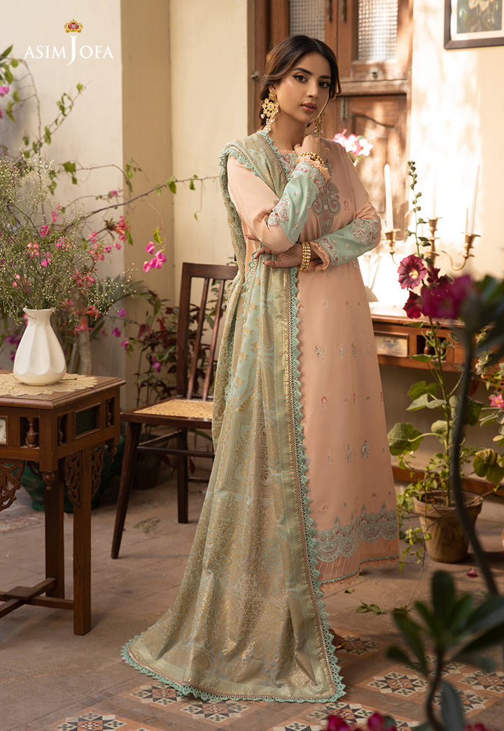 A graceful pale peach canvas is artfully illustrated with floral embroideries depicting contrasting shades of mint green. A detailed cotton slider borders etched with intricate embroidery adds exquisitely unique dimension to the shirt. Accompanied by a solid trouser and a golden dust print chiffon dupatta.