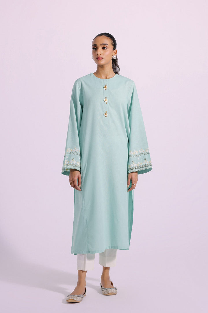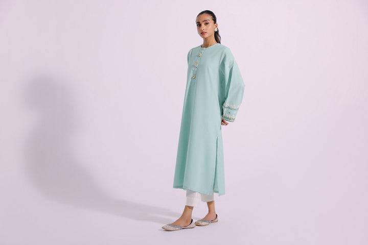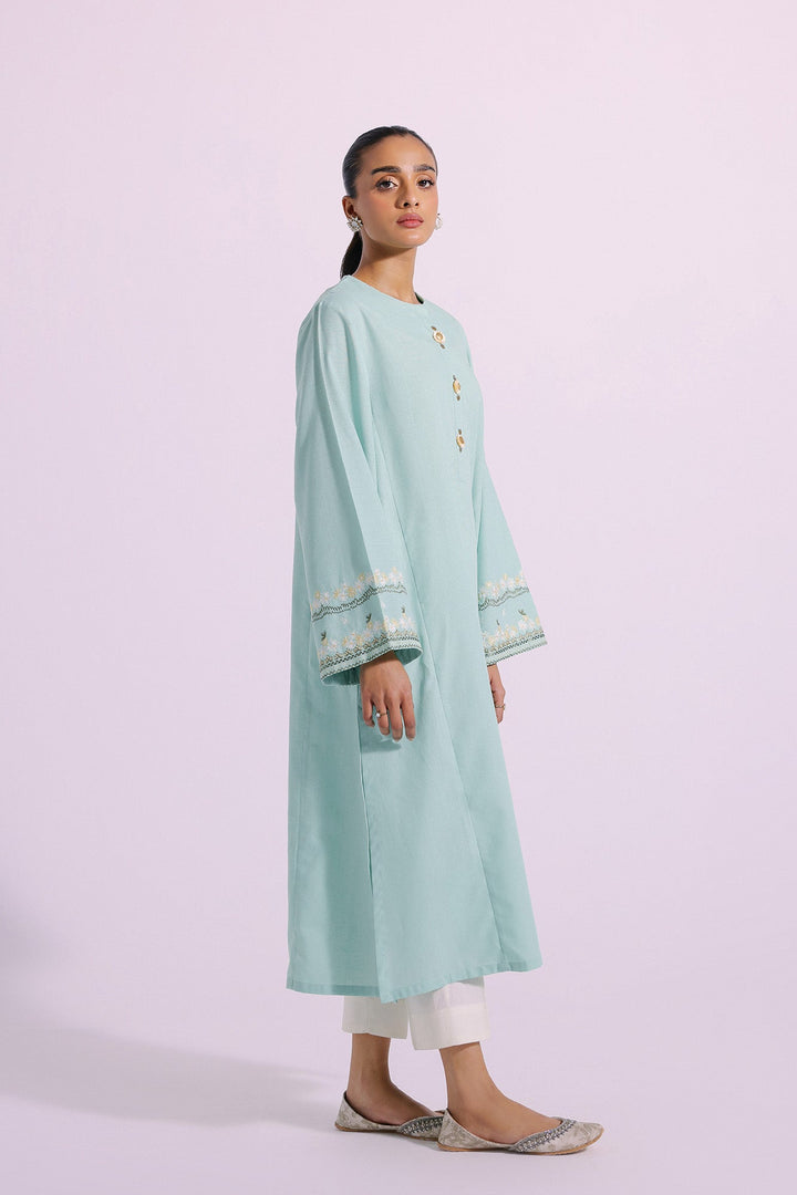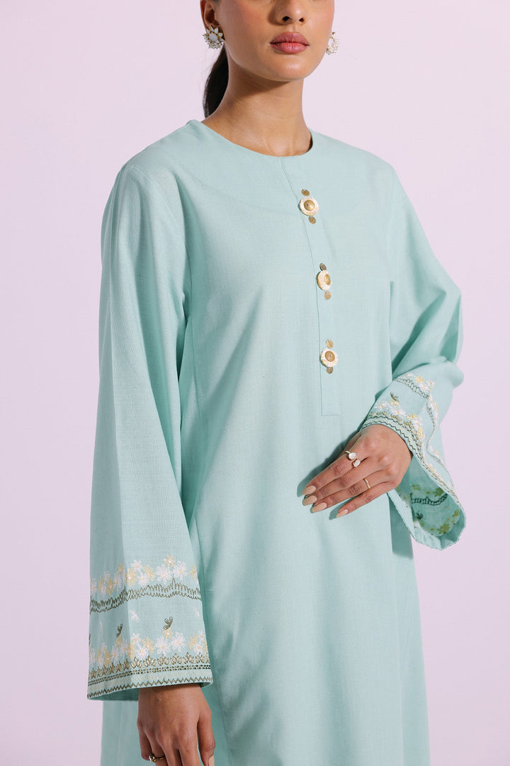 A classically chic design is layered over this gorgeous shirt illustrated in light green hue. Crafted in a contemporary silhouette and enriched with intricate embroidery at sleeves in enchanting colors and enhanced with trendy beads at front placket, this sophisticated shirt is a resplendent outfit to style this season.