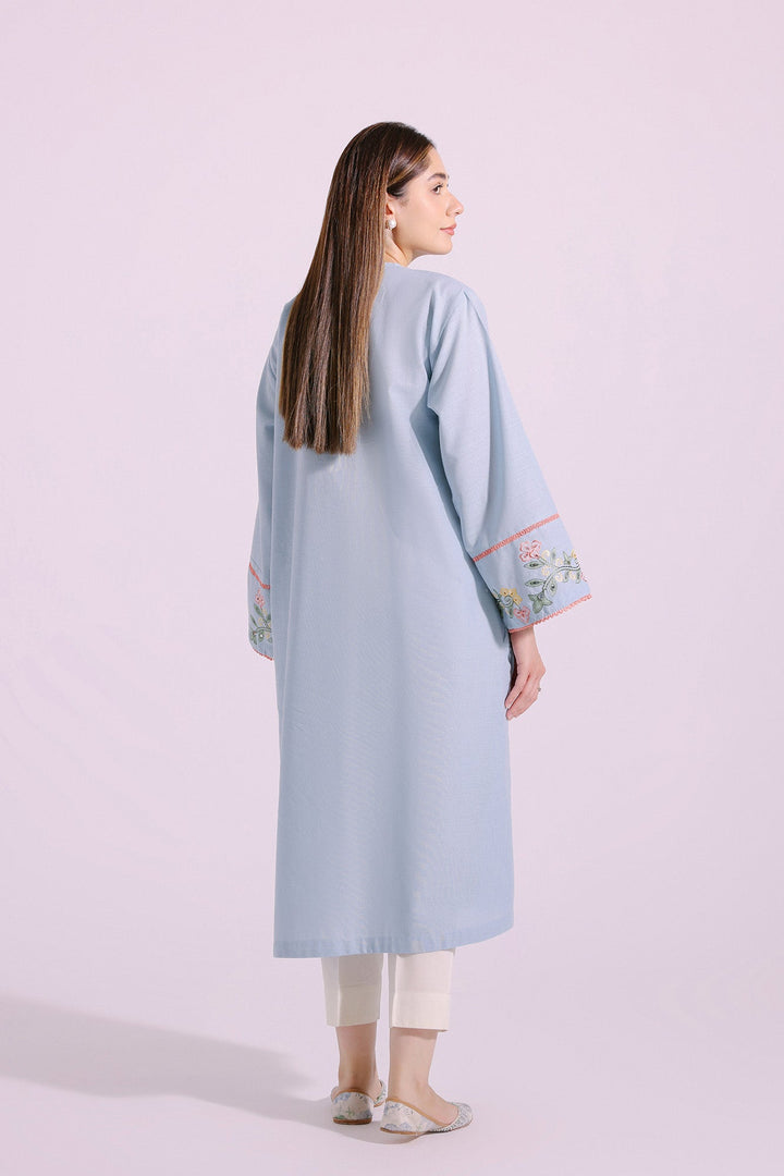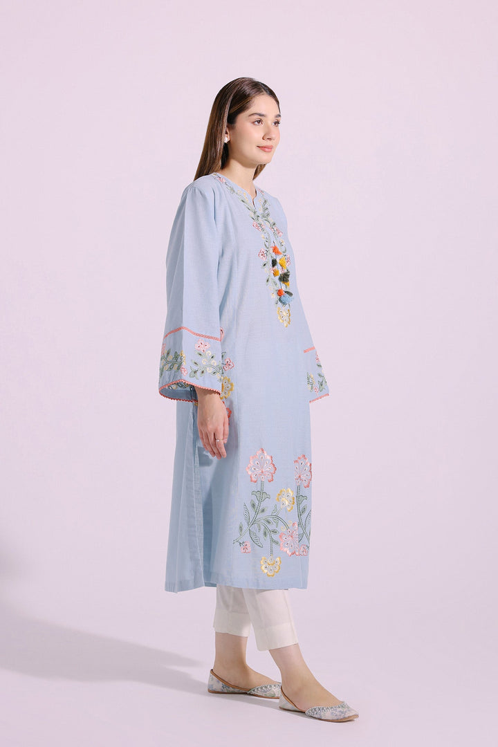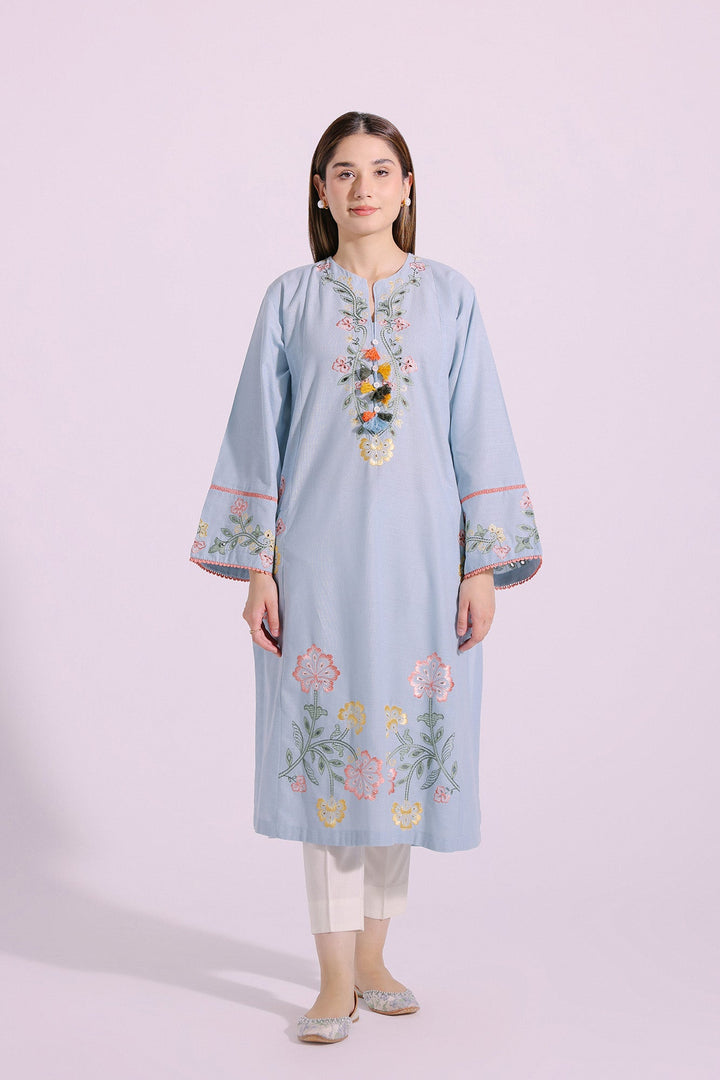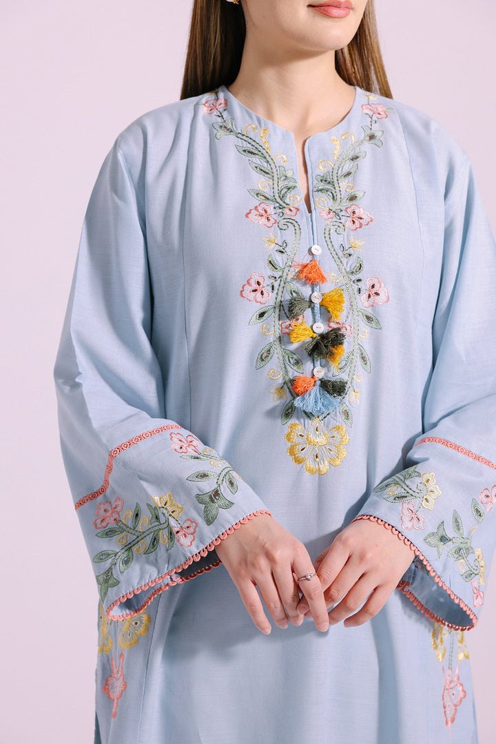 This gorgeous shirt brings a touch of elegance to your wardrobe with its classy style. The light aqua color is further elevated with aesthetically rich floral designs embroidered at vibrant hues with schiffli designs and enhanced with threaded tassels and buttons at front. Its graceful and sophisticated A-line design makes it a timeless choice.