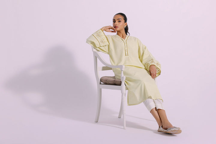 Look radiant this season in this fascinating shirt illustrated in a pale yellow shade. Crafted in a classy silhouette and beautifully adorned with leaf designs embroidered at sleeves and enhanced with delicate laces and beads at front placket. Look graceful at day gatherings in this resplendent outfit.