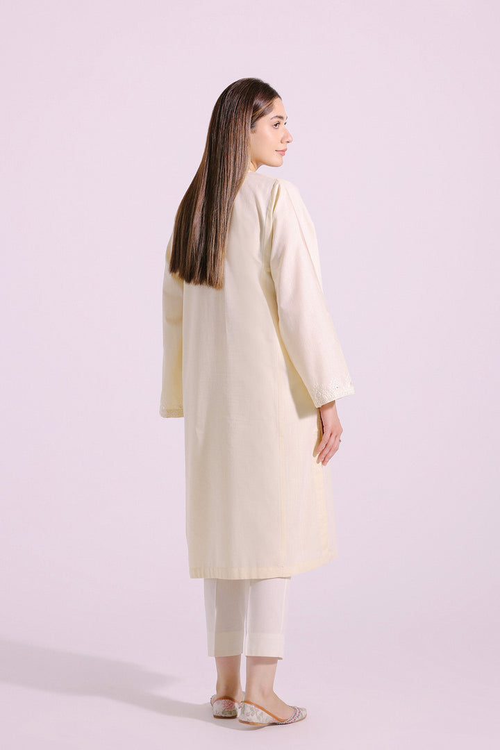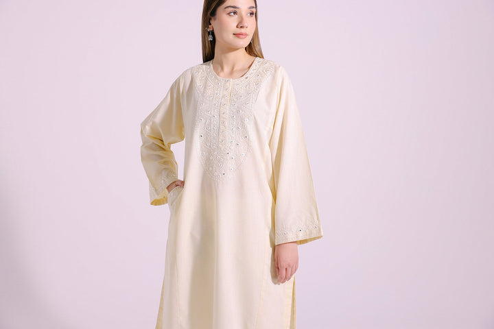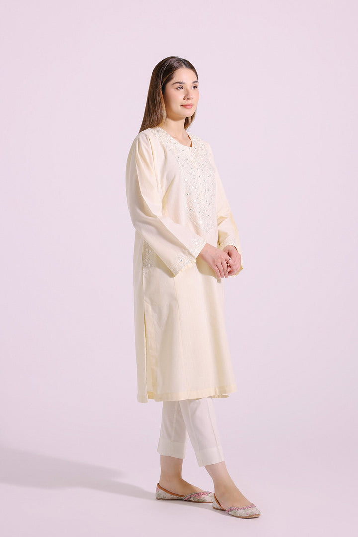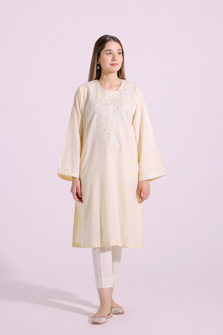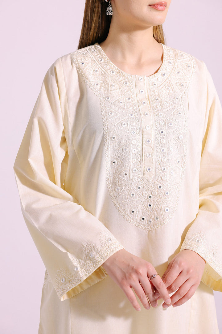 A gracefully elegant composition is portrayed on this exquisite shirt rendered in pale yellow shade. Beautifully crafted in a classy silhouette and enriched with intricate embroidery and enhanced with artificial mirror details, this sophisticated shirt is a perfect option to embrace the traditional look this festive season.