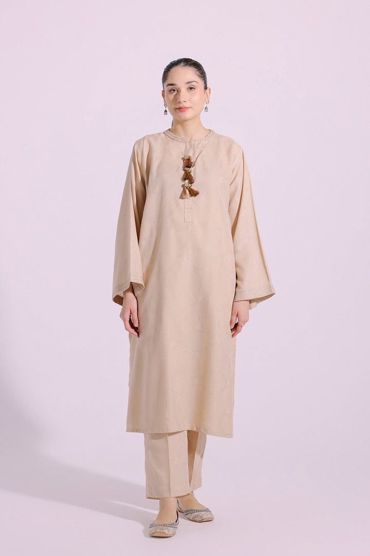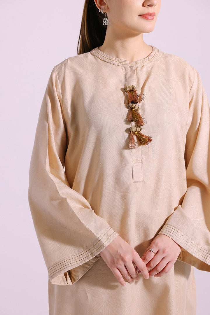 This classy outfit is perfect for everyday events. It is crafted from elegant and sophisticated  fabric in a subtle yellow beige hue. Its contemporary silhouette shirt is embellished with beads and tassels at the front and adorned with stitch details, while its tonal trousers complete the statement look. A truly timeless two-piece ensemble to style this fun season.