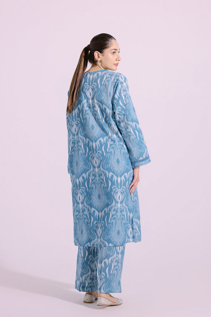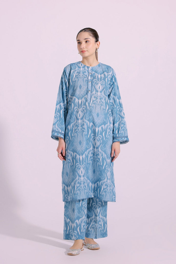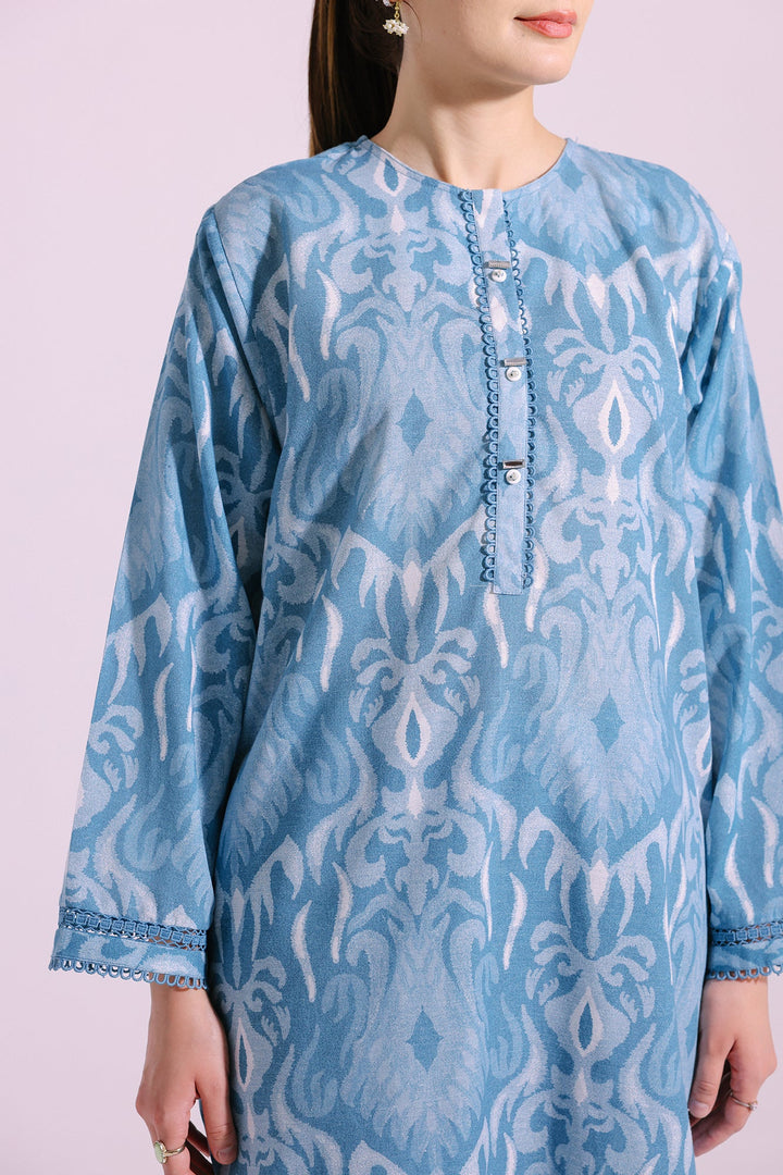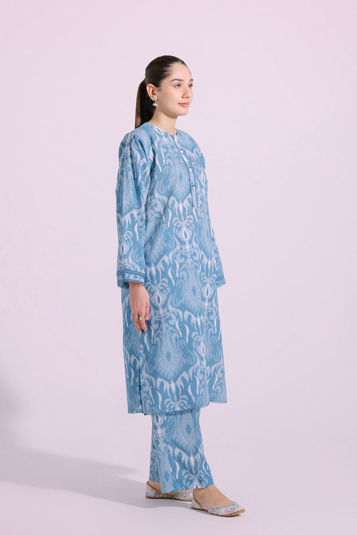 A contemporary yet classy design is portrayed on this graceful ensemble rendered in cyan blue shade. It features a chic shirt enriched with fascinating prints in mesmerizing hues and enhanced with classy buttons and delicate lace at front. Paired with a matching trouser, this gorgeous outfit is a style statement for fun gatherings this season.