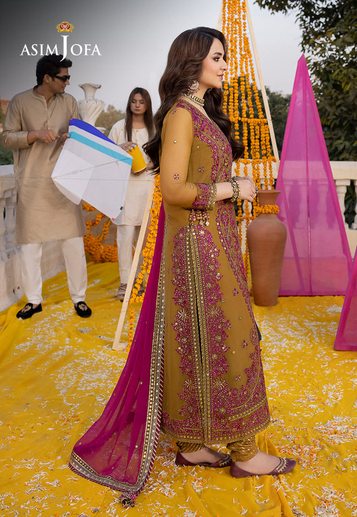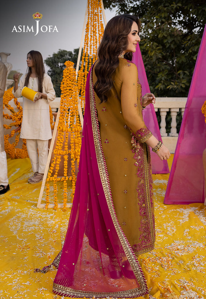 Embrace Majestic Fusion with this gold mustard ensemble, a contemporary design that marries tradition with modernity. Adorned with deep magenta aari thread and stitch, the embroidered right and left panels along with the back, create a regal tapestry. The 3mm and 9mm gold sequins add a touch of opulence while the contrasting deep magenta dupatta with four-side borders completes this ensemble with a majestic flourish.