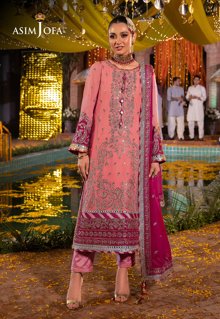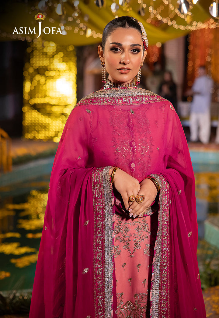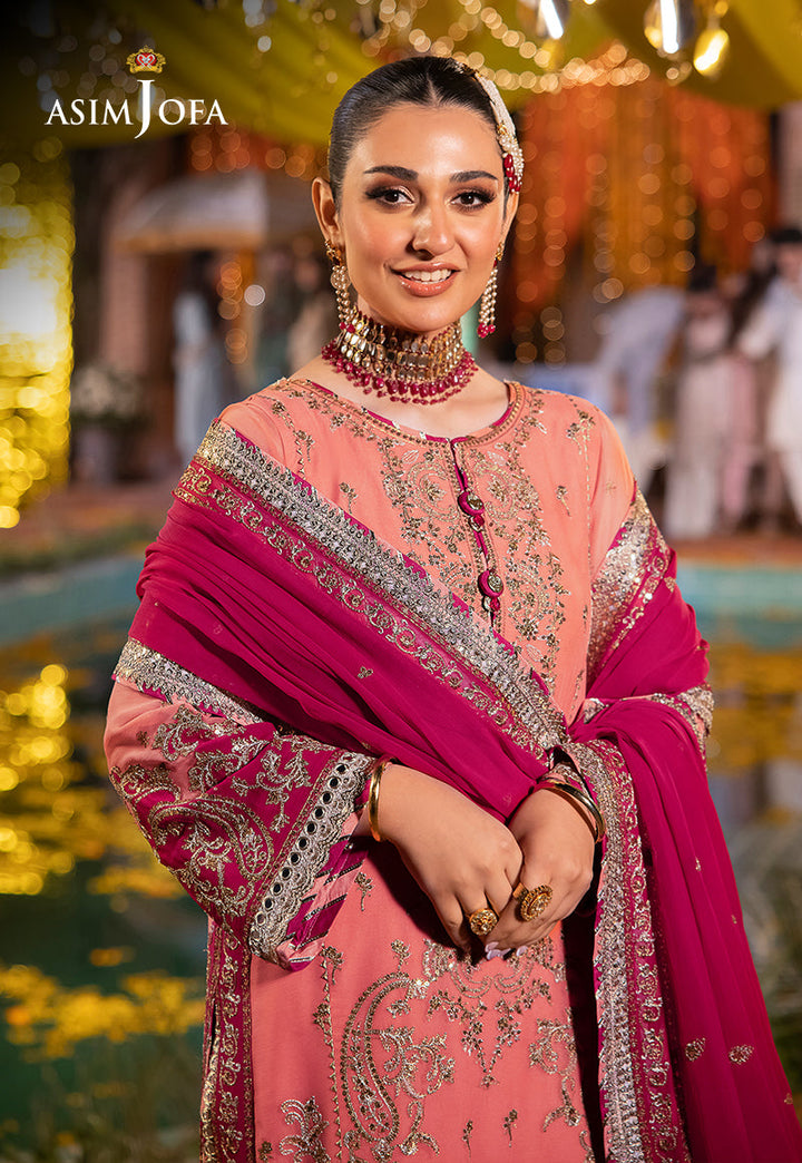 Embark on a Harvest of Radiant Bliss with this peach ensemble from the "Bajre Da Sitta" collection. Sarah Khan's vivacious presence graces the golden harvest of creativity echoing the soulful beats of a desi wedding. Adorned with light and antique gold cupped spangles this peach number with cardinal red borders and dupatta is a vibrant tapestry of tradition. The embroidered center and side panels along with sleeves and dupatta is a dance in harmony—a symphony of emotions where bold hues sing a melodious ode to the joy found in the heart of every desi wedding.
