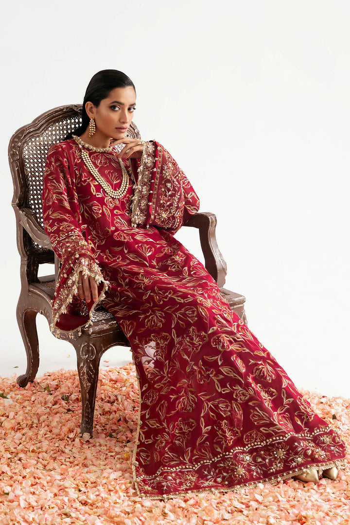 Radiate absolute glamour in 'Étoile Rose', where the rich barn red canvas comes alive with mesmerizing beauty. Intricate gold threads and tilla weave a scintillating tapestry, conjuring vibrant illusions of scarlet, tangerine, and gold. This sumptuous fabric is a true indulgence, allowing you to fashion looks that are perfect for soirées and festive occasions. Let your style radiate with the allure of this captivating masterpiece.