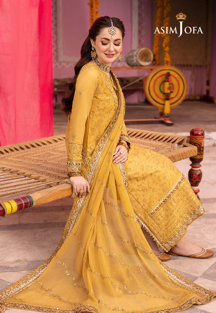 Discover Charm and Luxe in the Marigold Melody of this stunning outfit. The pale marigold yellow with its self-thread design and gold zari, is adorned with cupped sequins for added allure. The rhythmic pattern on the front and back of the shirt along with the grand neckline weaves a melody of charm and luxe. From the embroidered sleeves to the dupatta, this ensemble is a true symphony of elegance.