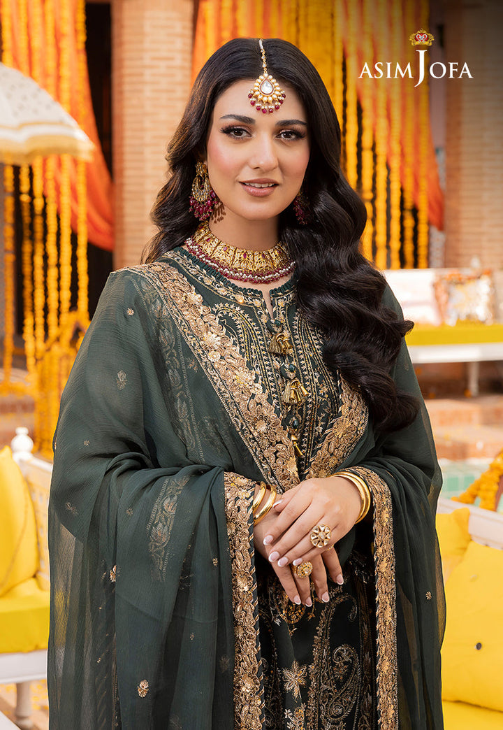 Illuminate your style with stardust luminescence in this bottle green ensemble from the "Bajre Da Sitta" collection. The paisley and floral embroideries adorned with beige threadwork and antique gold zari are like celestial constellations on the rich green canvas. Sequins and spangles add a touch of magic transforming the garment into a symphony of emotions. This ensemble is a vivid ode to the joy found in the heart of every desi wedding where bold hues sing a melodious celebration.