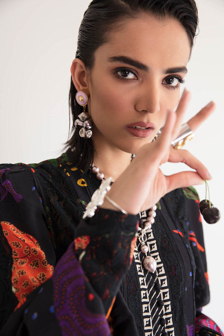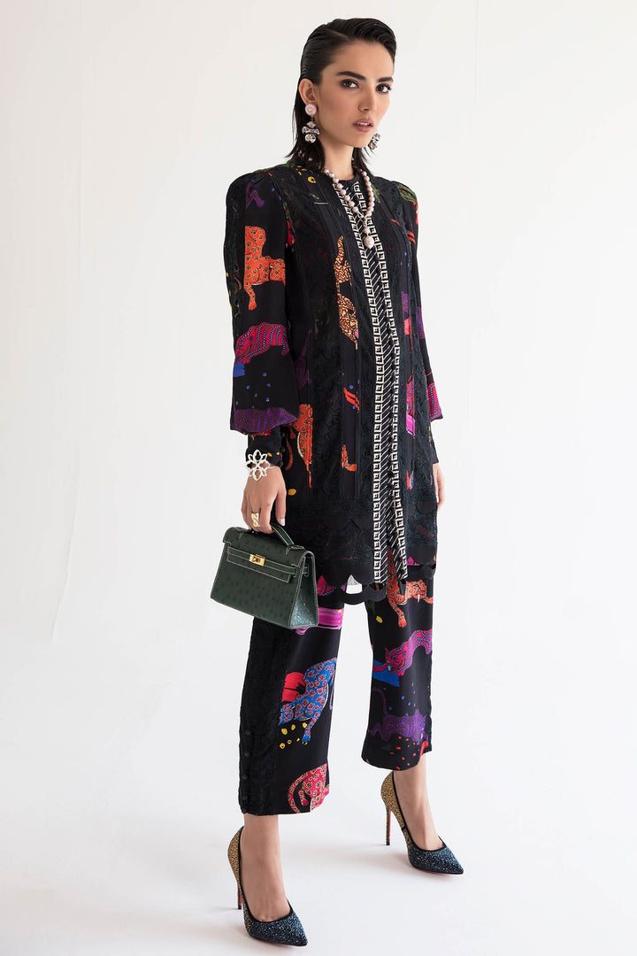 Take flight into style with 'Oriane', featuring a striking black base elegantly illustrated with vividly illustrated wild fauna. The vibrant hues of magenta, tangerine, scarlet, azure, and green bring the design to life, making it a feast for the eyes. The varrying shades of each wild character are painted beautifully, while the delicate obsidian lace insets bring lend the design a sense of playful whimsy. The obsidian canvas serves as the perfect backdrop, highlighting the bright colors and the front open style with a tessellated border adds an element of sophistication. Paired with printed pants,'Oriane' is sure to make a bold and beautiful statement whether it’s an evening soirée or an Al fresco affair.