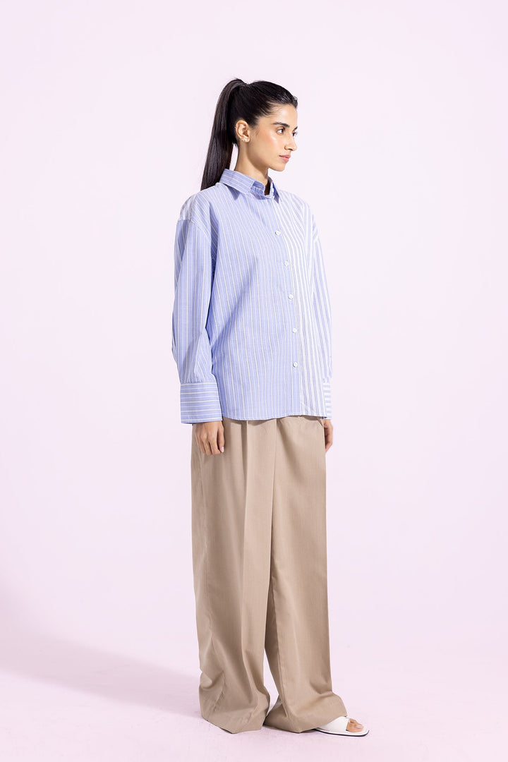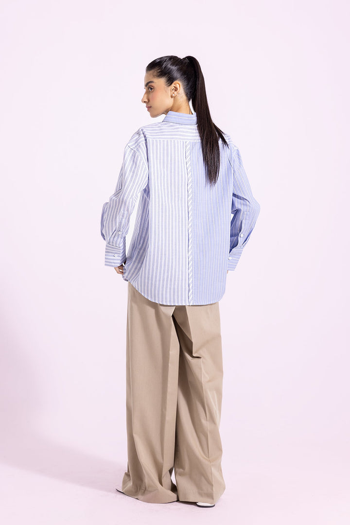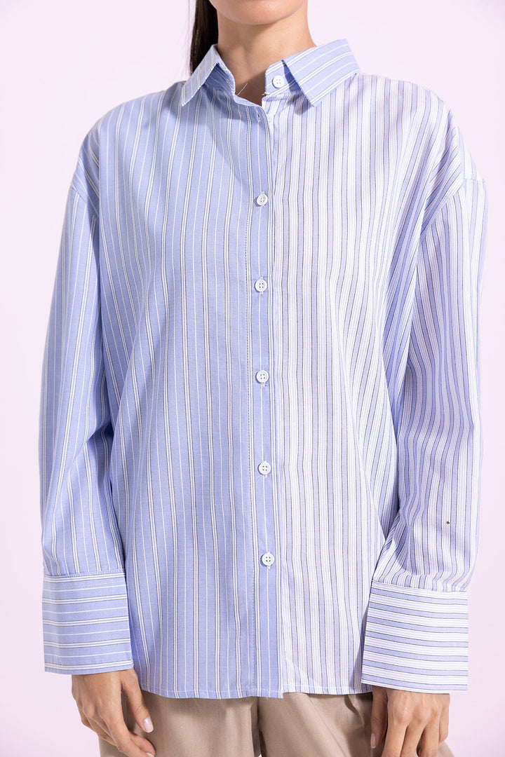 This statement outfit is a perfect addition to your wardrobe. This classic dusty blue shirt features a button down silhouette with collar neck and enriched with stripes. Illustrating an experimental design with half shirt portrayed in contrasted hues, its well-crafted construction and timeless design makes it a must-have for any fashion-forward individual.