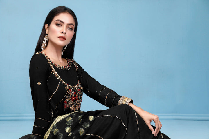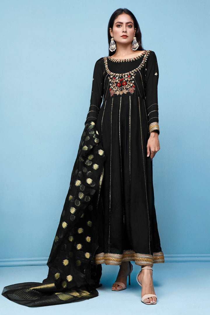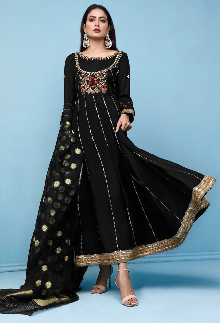 Truly a masterpiece to behold. Win your audience's attention with these exquisite long black peshwas, featuring a classic design and a traditional aesthetic. The bodice and neckline are complimented beautifully with striking kora patterns and floral motifs, which work together to create an enrapturing design. It's paired with a black organza dupatta, heavily adorned by a plethora of banarsi motifs and gota lace work at each end. The flare is perfect for a princess twirl, with multi-panel work ending with a bespoke heavy lace on the daman.