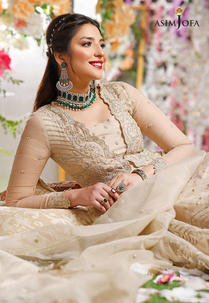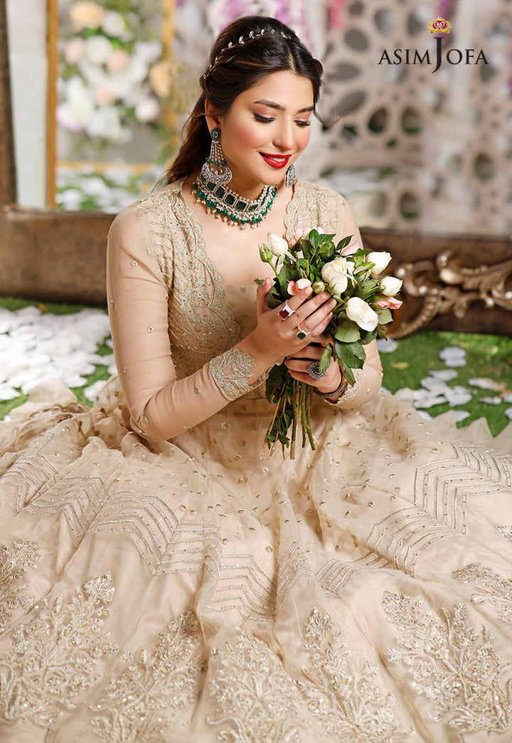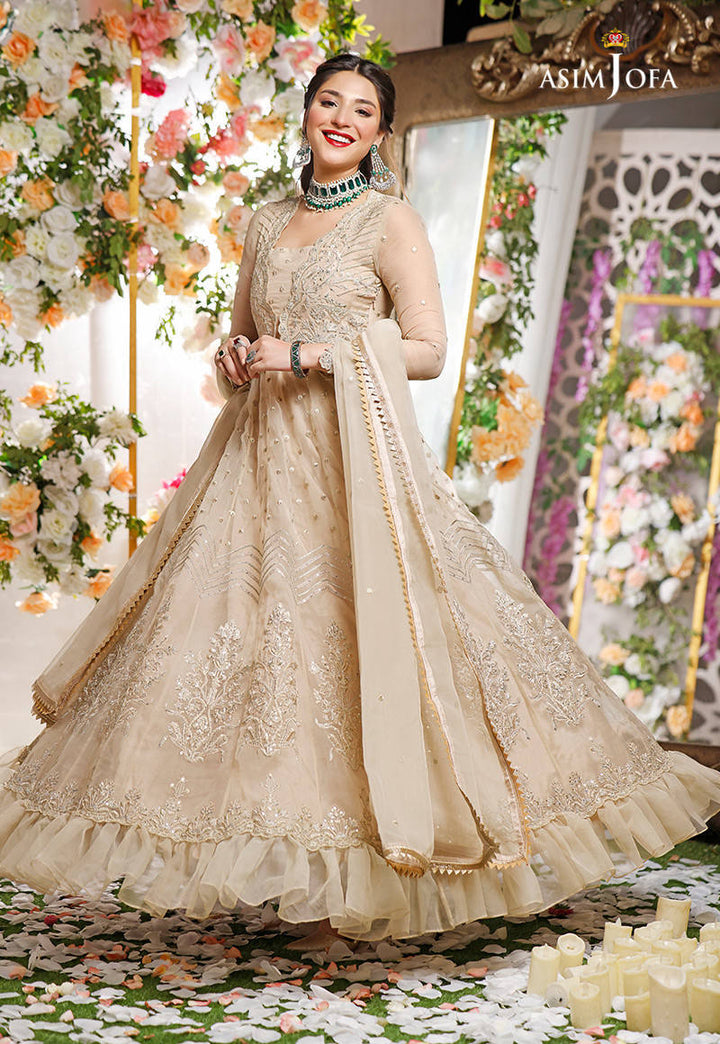 Ramsha Khan is the epitome of unmatched grace in this pretty beige ensemble. A voluminous cut accentuates her willowy form with intricate embroidery on bodice and panels using beige thread with silver zari and sequins. This dress ends with a fan pleated organza trim highlighting the hemline embroidered border and its dupatta is also rendered on the same tone organza with delicate chan.