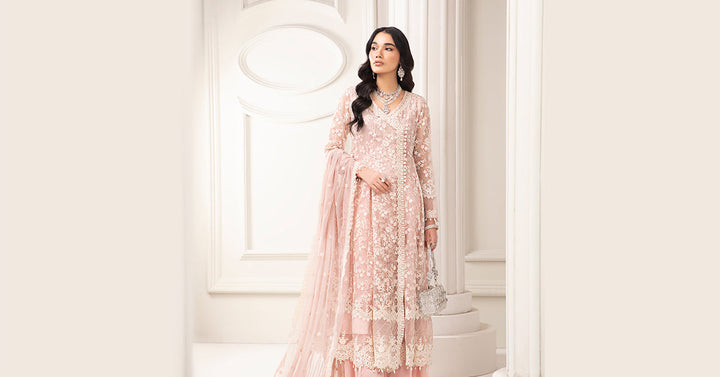 Evoke a dreamlike aura with our three-piece embroidered organza suit, showcasing a light pink hue angrakha, creating a mesmerizing tapestry of floras with delicate threads and sequins, elevated with breathtaking pearl detailing, this work of art is a sight to behold. Complemented by dyed Wide-Leg Trousers and a dupatta, meticulously crafted by a cascade of sequins and thread embroidered floras and delicate pearl trim that offers a truly refined look for all your soirees