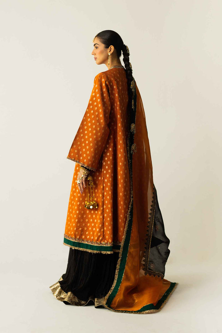 Dupatta: Organza This rust and black ensemble is perfectly paired with a crushed lehenga for every occasion. It is detailed with resham and zardozi work with green accent finishings.