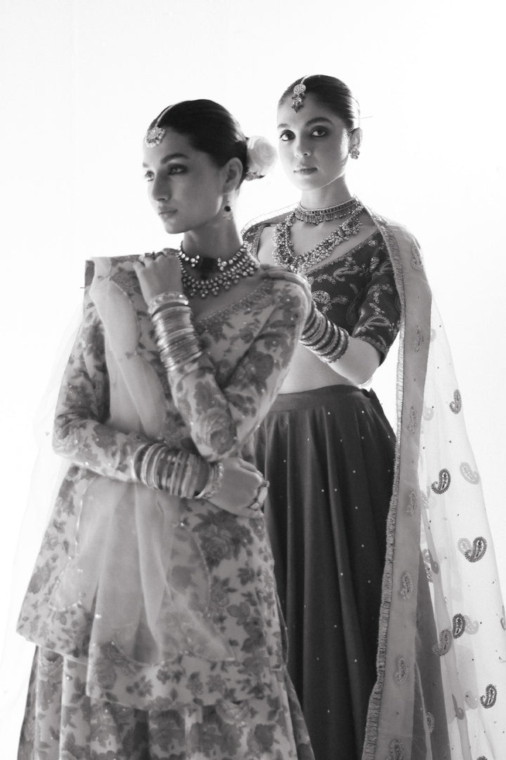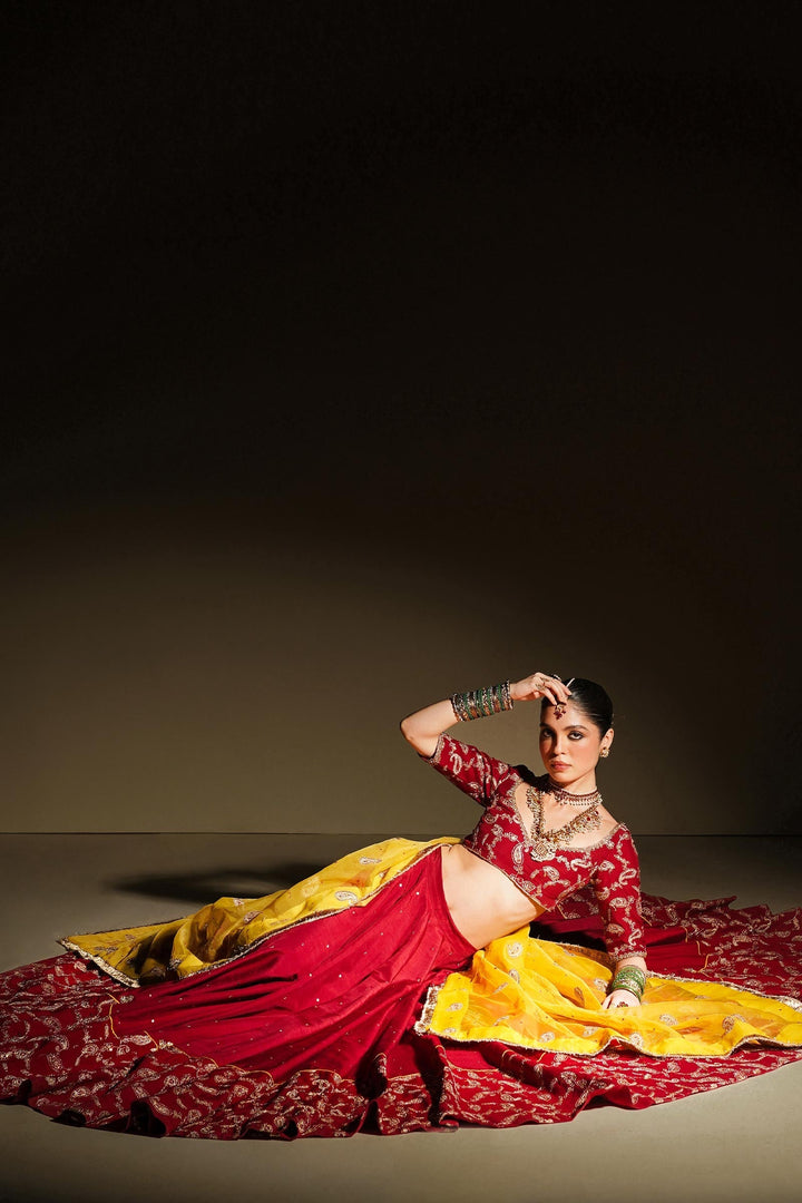 This red silk canvas, adorned with cut dana, naqshi, and dabka, along with the intricately embellished borders, creates a timeless and exquisite look. And the contrasting organza dupatta with sequin embellishment adds a touch of sparkle.