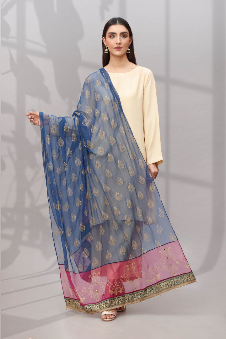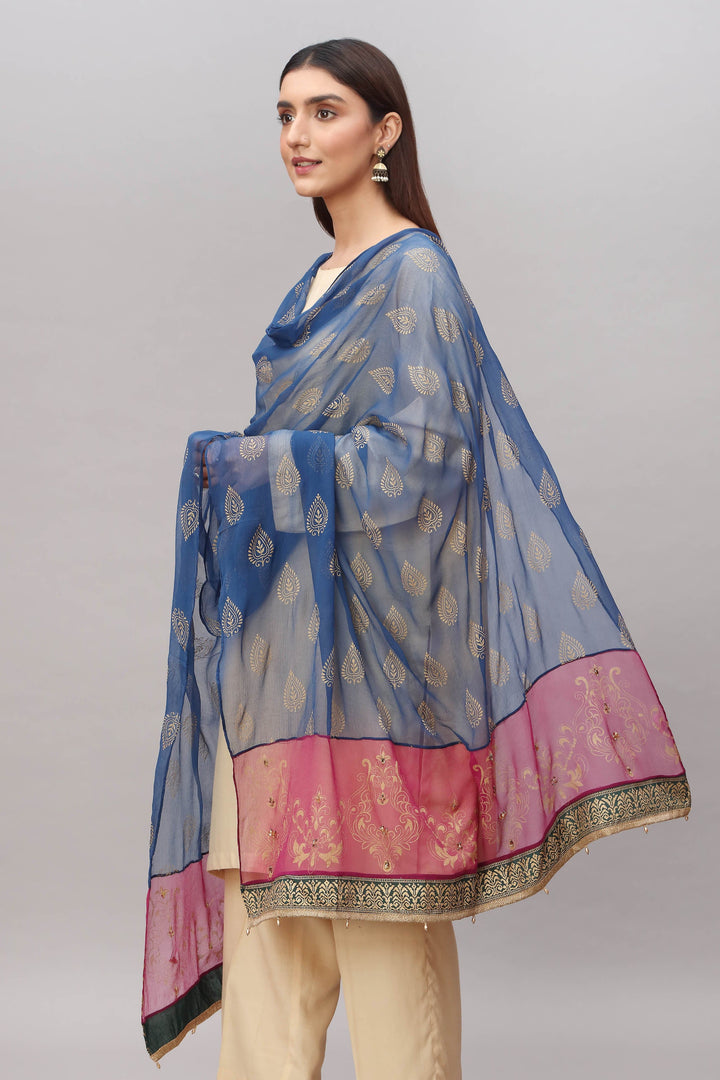 Chiffon Dupatta Hand Crafted With On Gold Printing Embellished With Cryatals + Pearls On The Border.