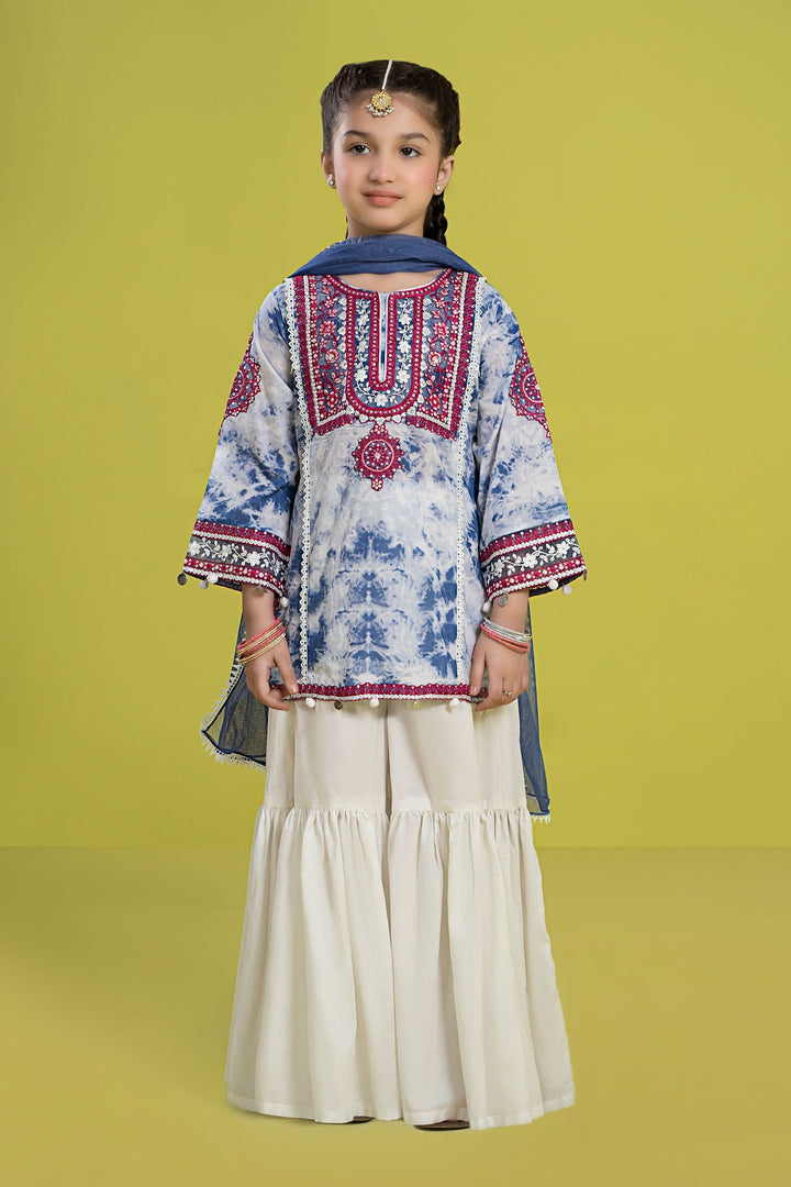 Add versatility to your girl's style with our 3 piece embroidered suit; featuring a tie and dye embroidered shirt embellished with crosia balls and paired with dyed gharara and dupatta with lace border.