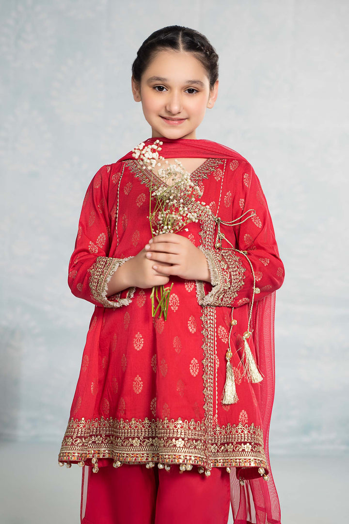 Revive the classic vibes with our 3 piece embroidered jacquard broshia suit; featuring a delicately gotta imbued sequin-tilla embroidered angrakha frock combined with kiran detailing, tassels, and tilla balls embellishment and paired with ghrara and kiran-border dyed dupatta, that effortlessly grace your soirees.