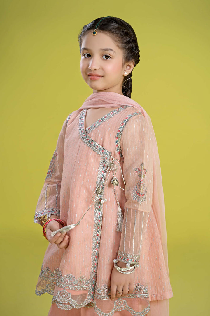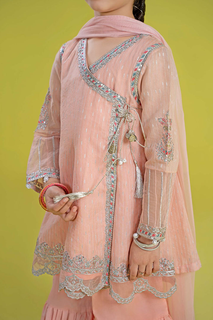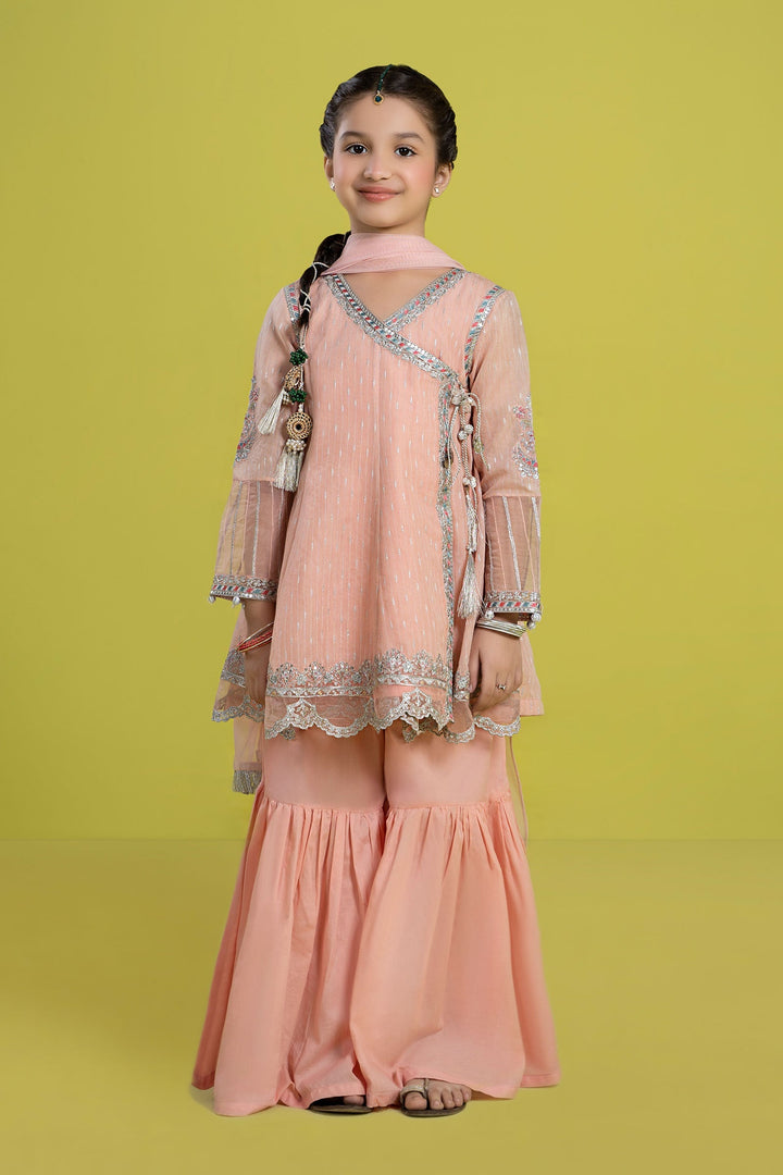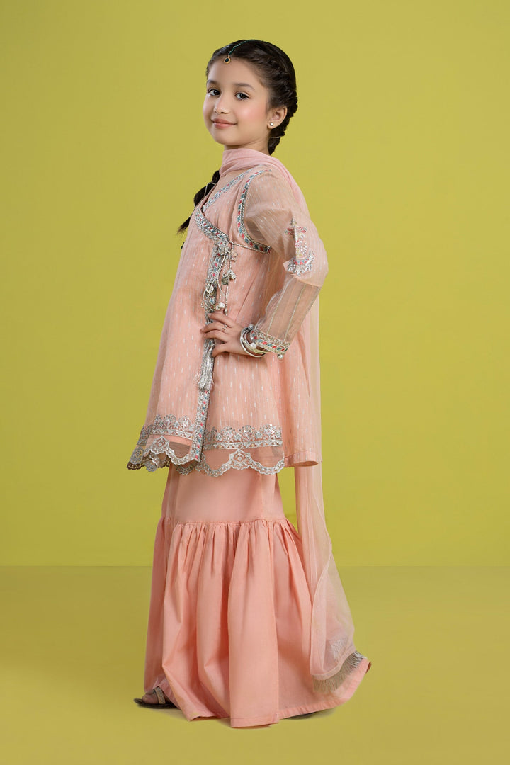 Bringing classic charm to your little one's wardrobe with our 3 piece embroidered jacquard zari suit, featuring a sequin-tilla embroidered angrakha rock combined with threadwork and pearl embellishments and paired with dyed gharara and kiran-bordered dupatta that instantly captivate.