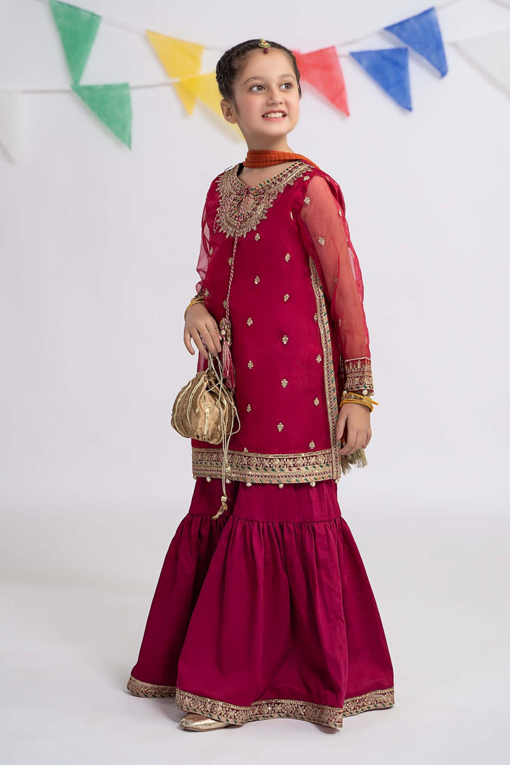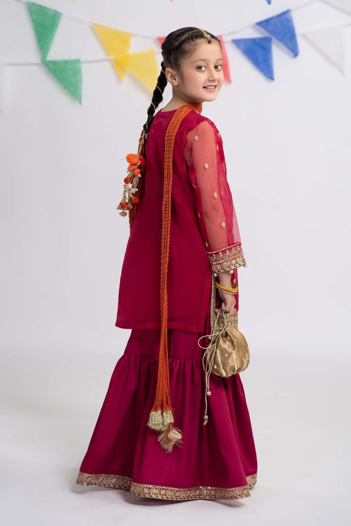 Wrap your little one in grace with our pink-hued 3 piece embroidered organza suit. Featuring a hyderabadi neckline style, sequins, thread, and tilla embroidered shirt. It is paired with gharara with threadwork, sequins, and tilla embroidery on the hem and a crushed dupatta framed with kiran detailing on the border, making it a classic choice for the perfect eastern look.