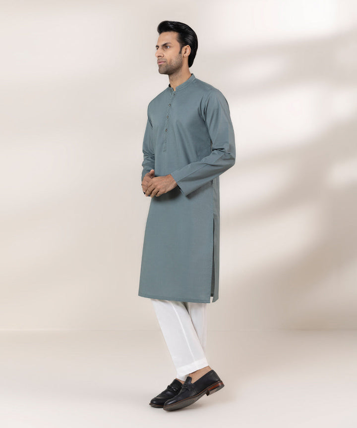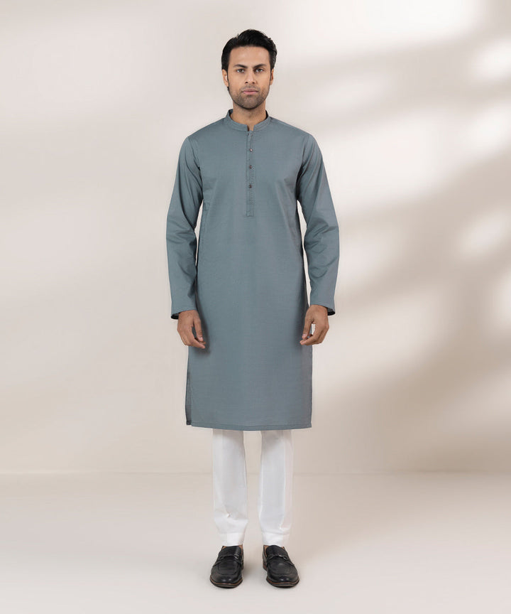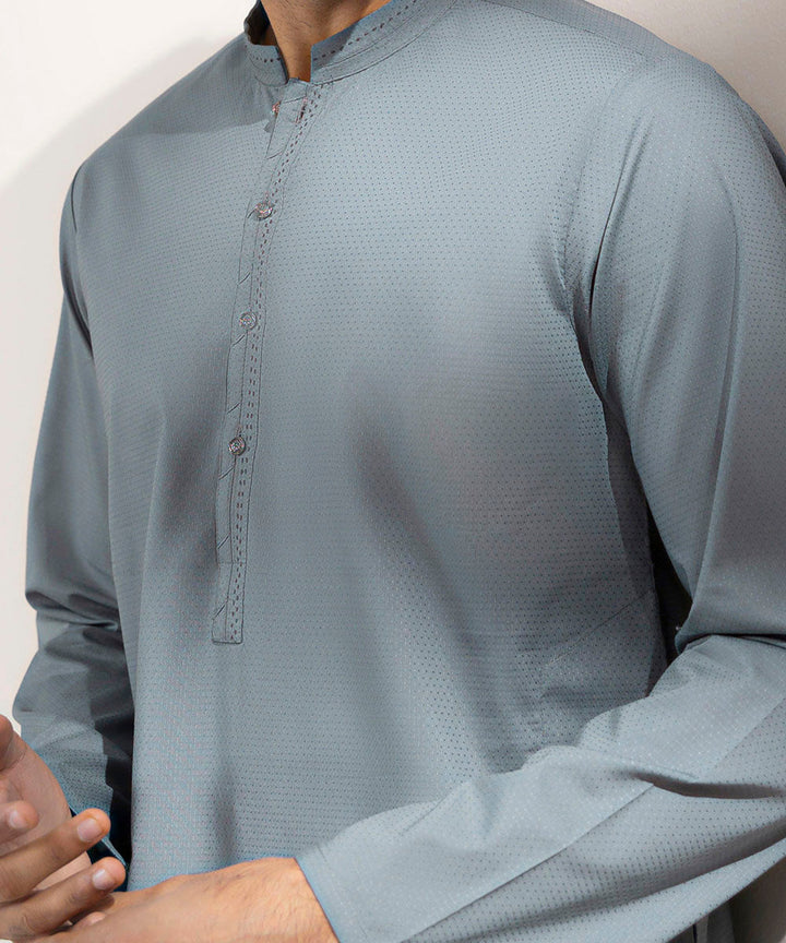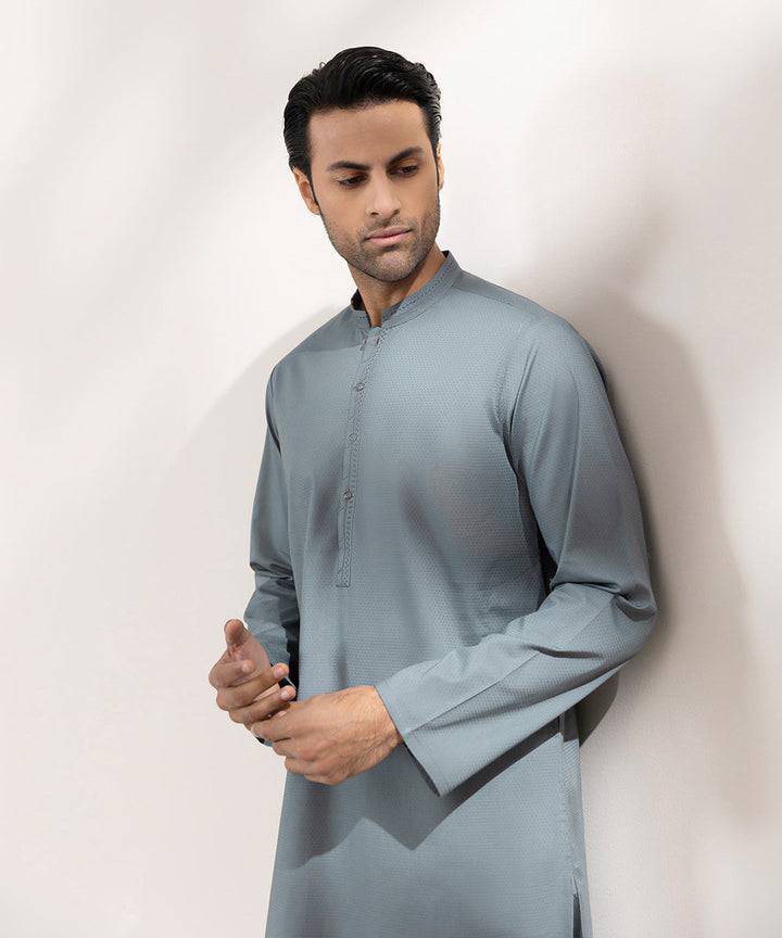 Refresh your wardrobe with our medium grey cotton dobby kurta featuring thread detailing.