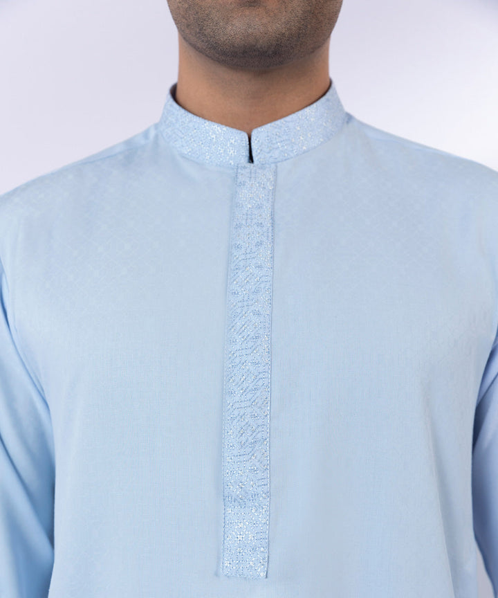 Elevate your style with our sky blue textured wash & wear kurta featuring intricate embroidery.