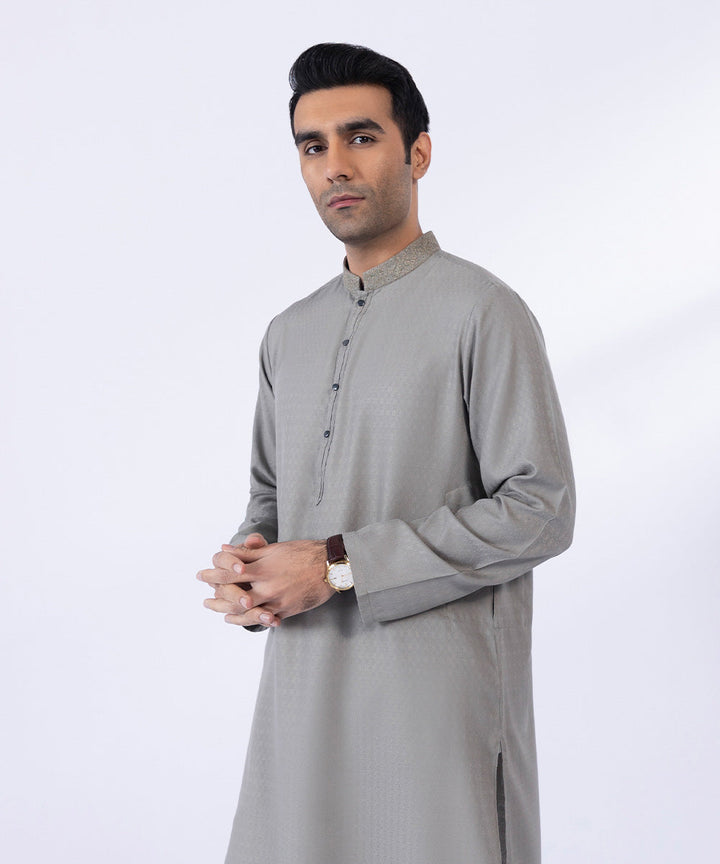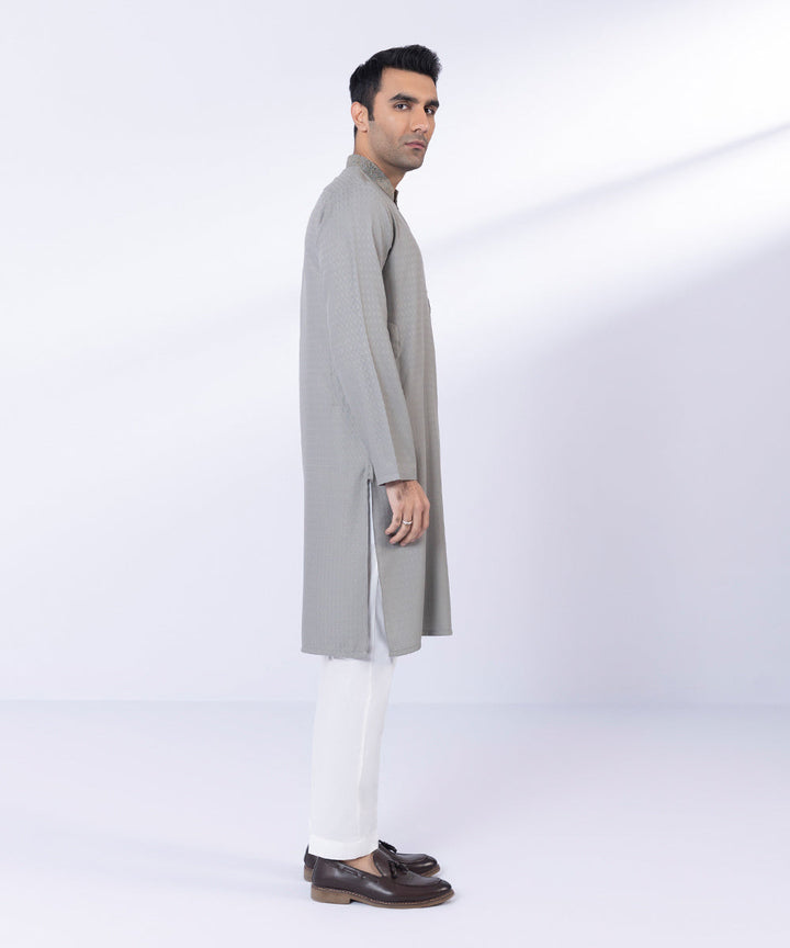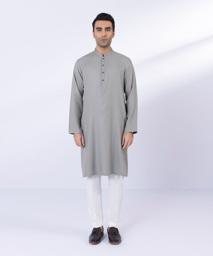 Turn heads in our olive textured wash & wear straight kurta featuring embroidery detailing.