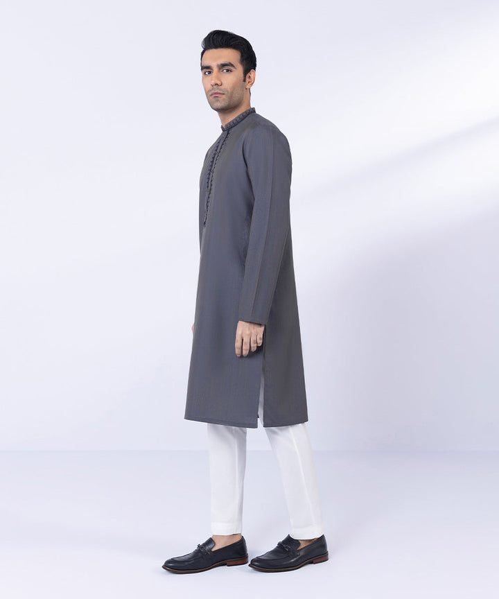 Turn heads in our blue textured wash & wear straight kurta featuring embroidery detailing.