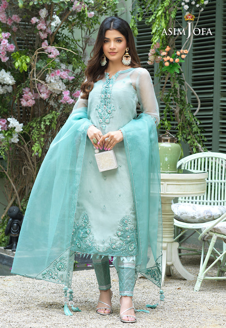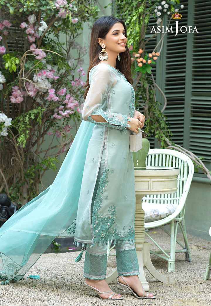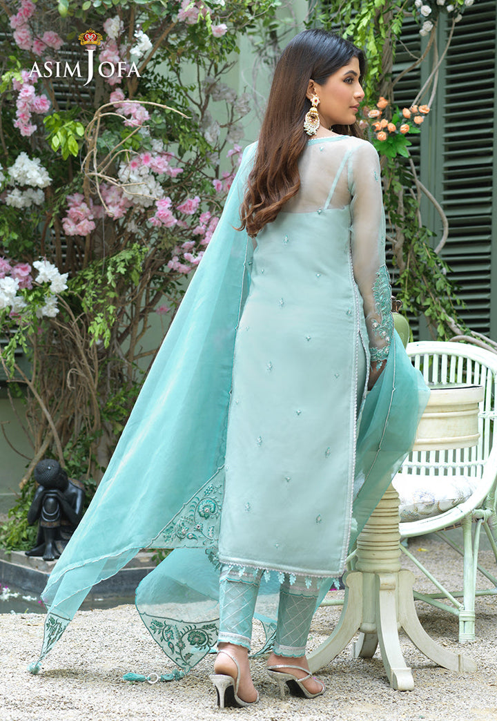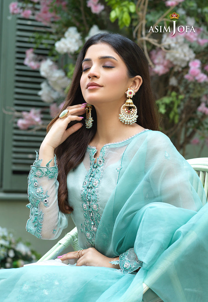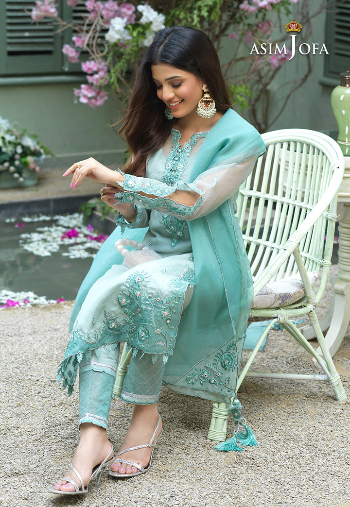 As fresh as morning dew Laiba gives off a soothing vibe donning this delicate design. On sheer organza mint monotonous color scheme is at work with threads highlighted by silver zari, lorex and mirror inserts giving it an edge above all. The shirt is pale mint bordered by dark mint organza L shaped side slits and daaman with details on sleeve hem and neckline. The dupatta is bordered with a geometric scallop pattern accentuated by embroidered corners glinting with mirrors. A solid cotton silk trouser rounds off the look of this design.