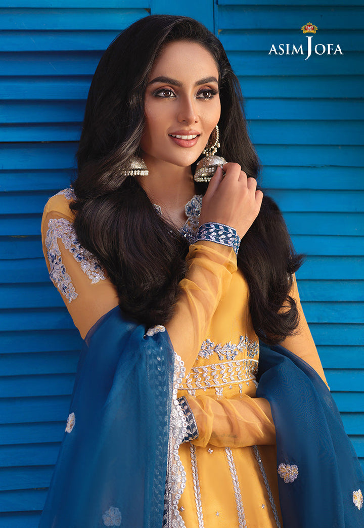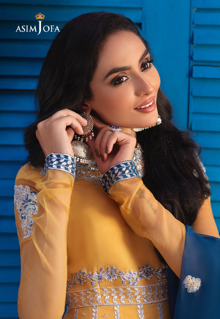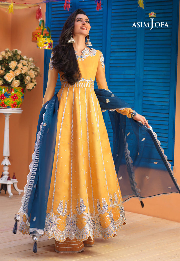 Truly experience the essence of basant clad in this honey yellow ensemble. The peshwas is rendered in silver zari and sequins with highlights of sapphire blue thread, it comes with a heavily embroidered dupatta sprawled on sapphire blue organza and same hued dyed silk pants.