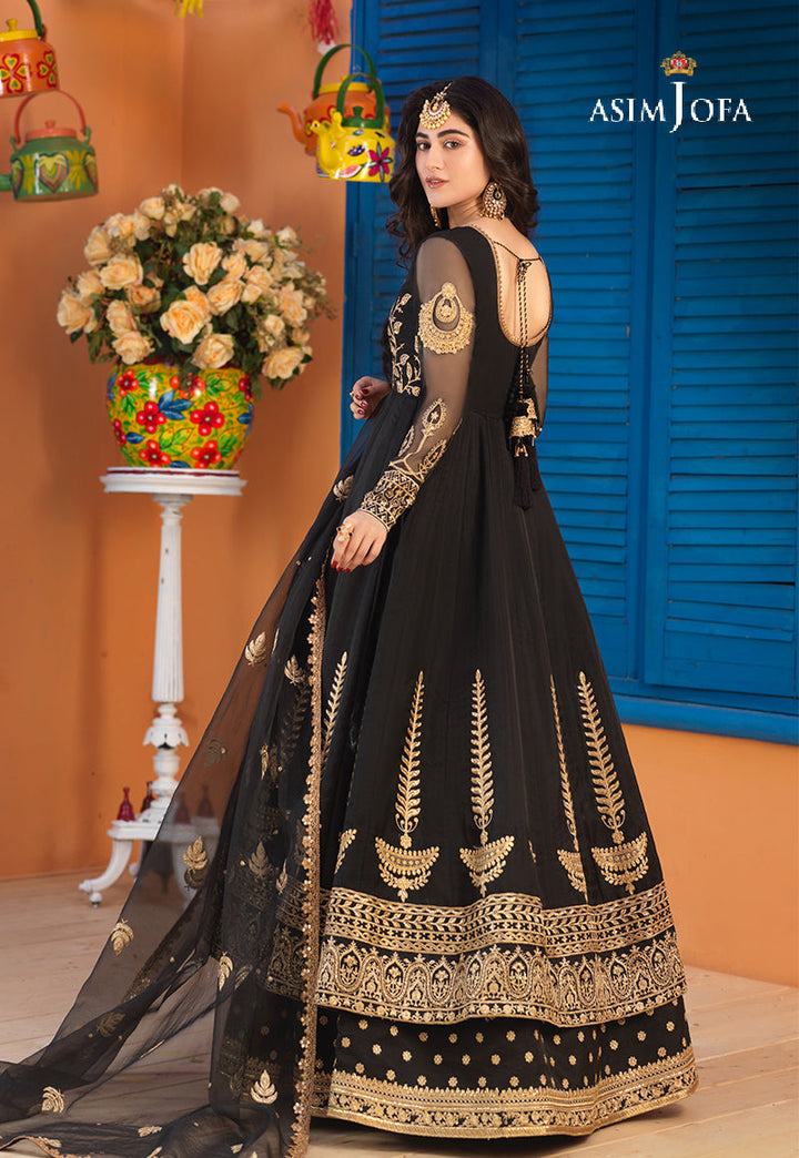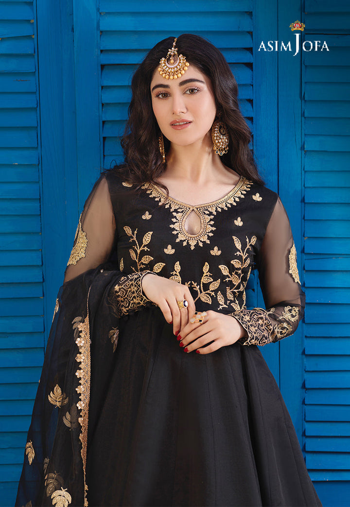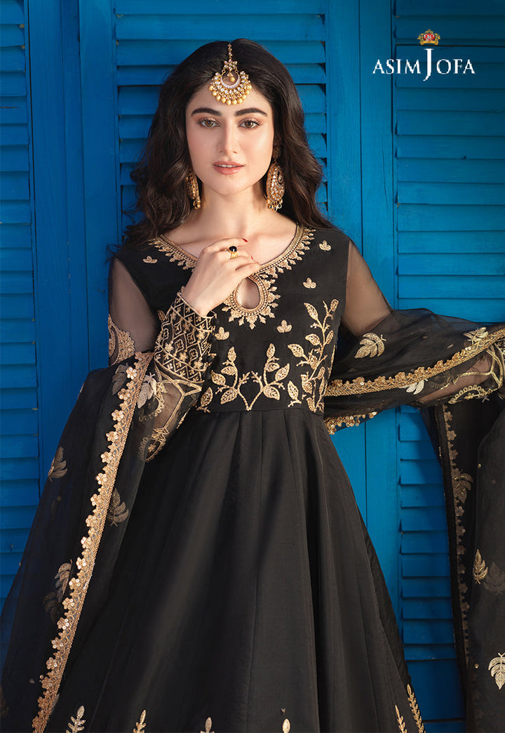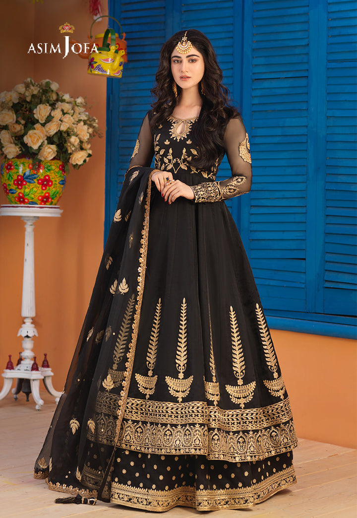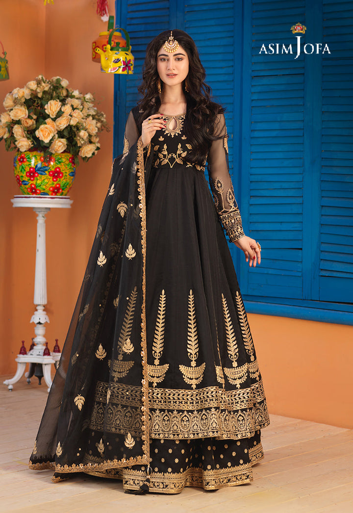 This dreamy Black pishwas is a classic statement piece for any festive occasion day or night. Monochrome is always in style. This black flowy pishwas enchanted with elegant gold embroidery and a running border on daman crafted with hints of sequins. Sheer classic sleeves edged with an embroidered border and motifs. It is paired with an organza dupatta with delicately scattered chan all over. Dress is complimented with a majestic embroidered lehnga in same shade. It is a perfect choice if you want to embrace a timeless look with an elegant display of the best of our classic culture.