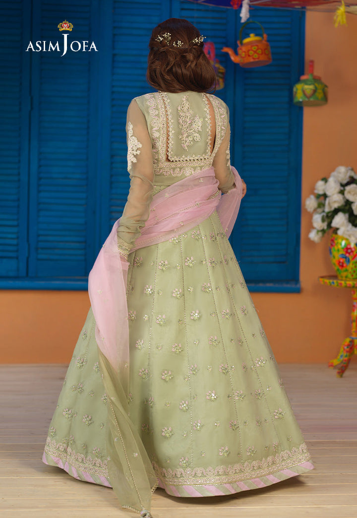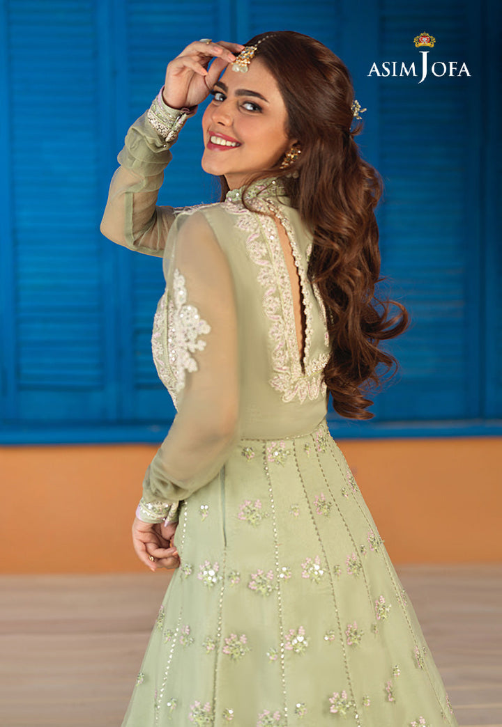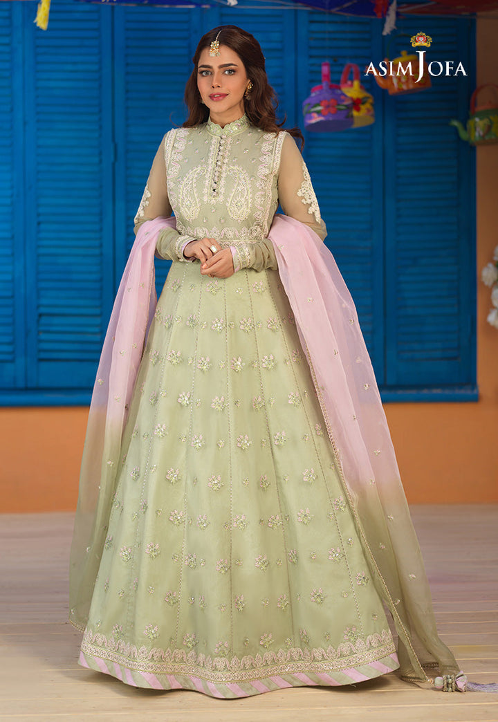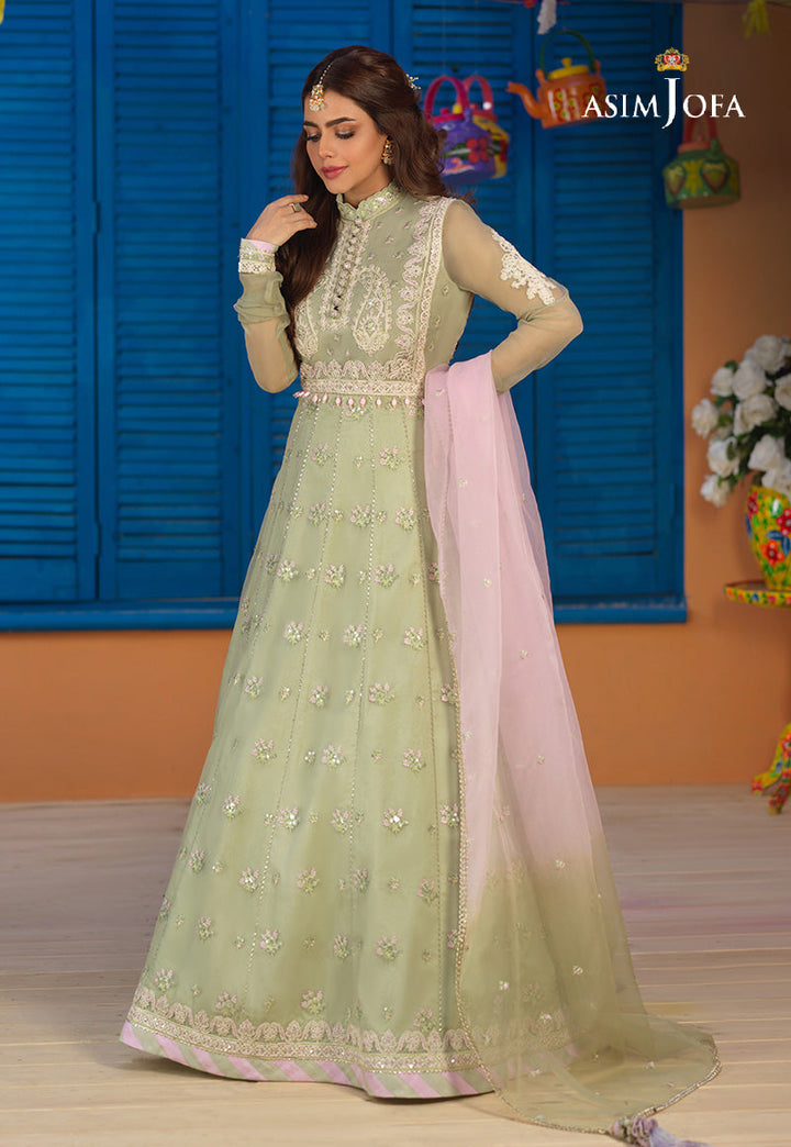 Featuring a beautiful mint green pishwas crafted in organza designed with a snug fully embellished bodice that kicks out into a full kalidaar pishwas ornamented with beautifully composed embroidery pattern in thread, zari, dori and sequins. Gorgeous embroidered border is running along the hem and it is paired with an embroidered two-tone dupatta and dyed cotton silk pants.