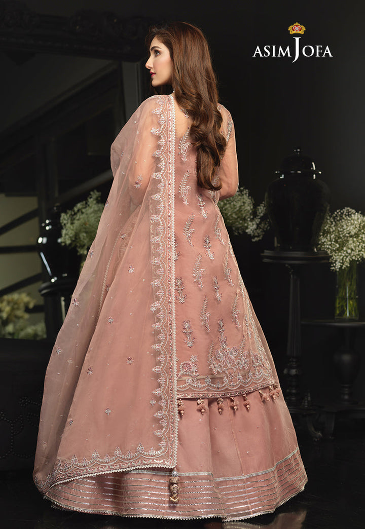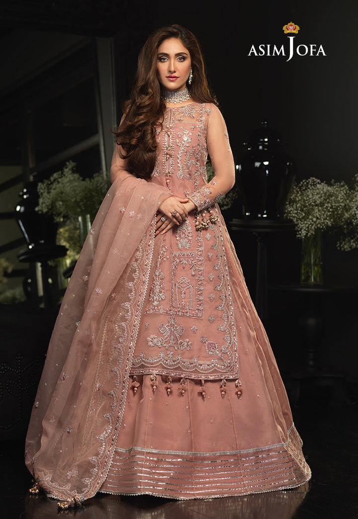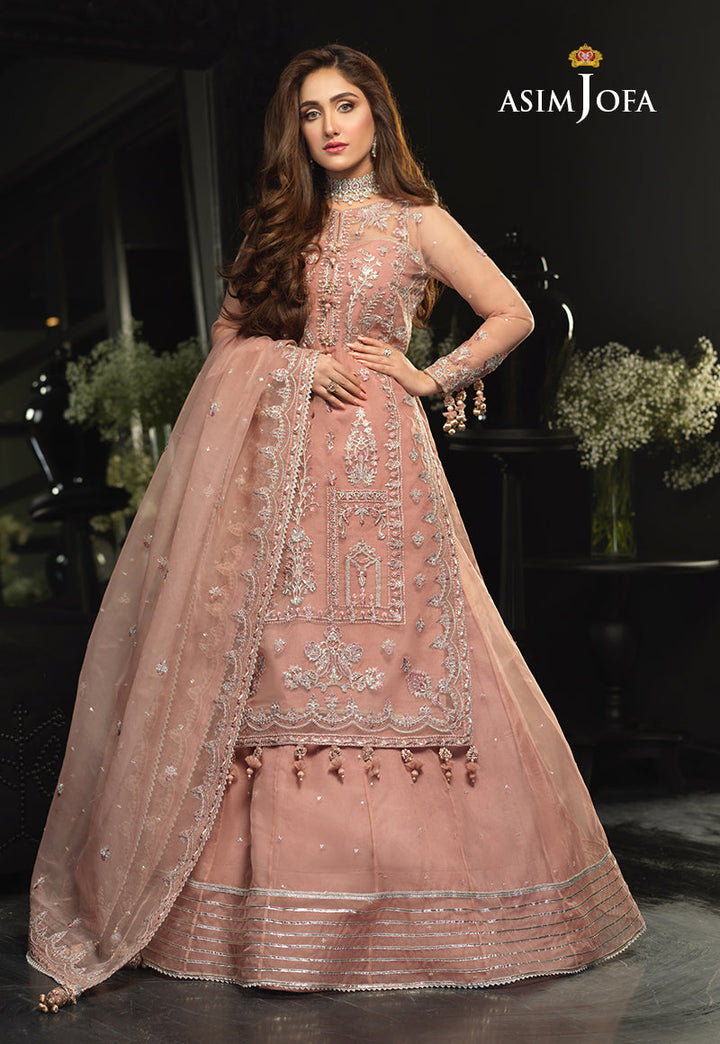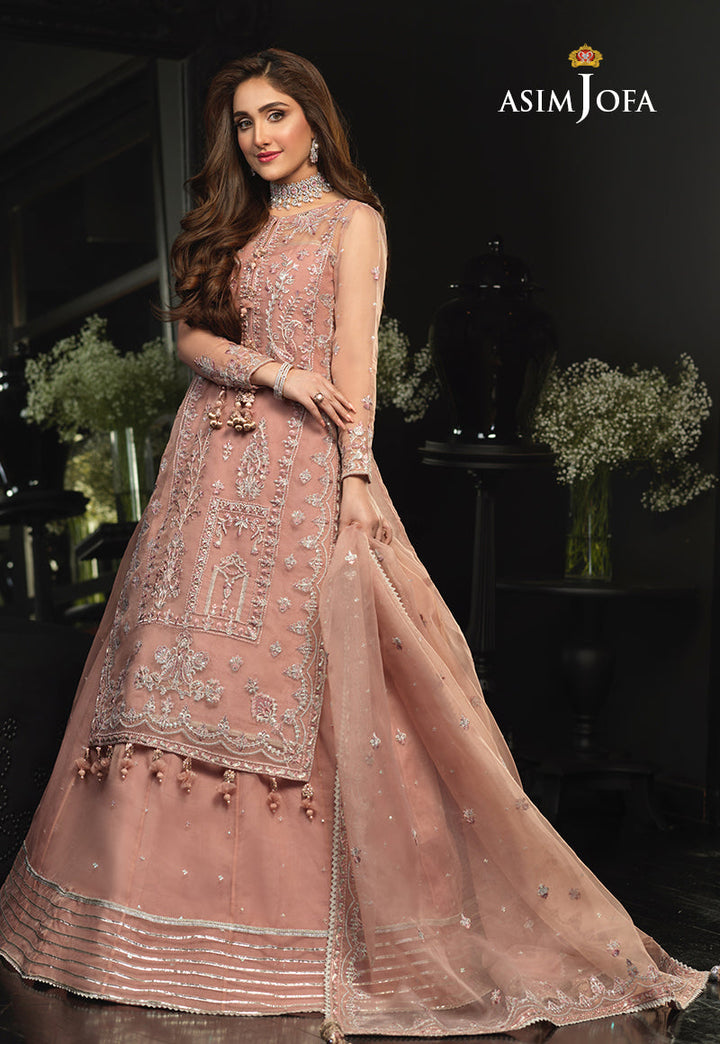 Get struck by Aiza’s stunning avatar in this breath taking design from Ishq-e-Naubahar. Clad in this beautiful dusty pink organza shirt worked in silver zari, badla and holographic sequins giving it a mesmerizing shine. The design is an asymmetrical pattern with floral imagery done with stunning detail. It is more dramatized by the addition of a heavily decked dupatta which is worked on four sided border and chan in middle with a lehnga sprinkled with spangles on organza. Dazzle all by donning this tasteful attire.