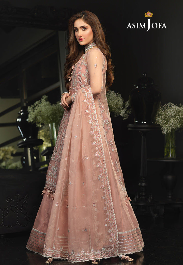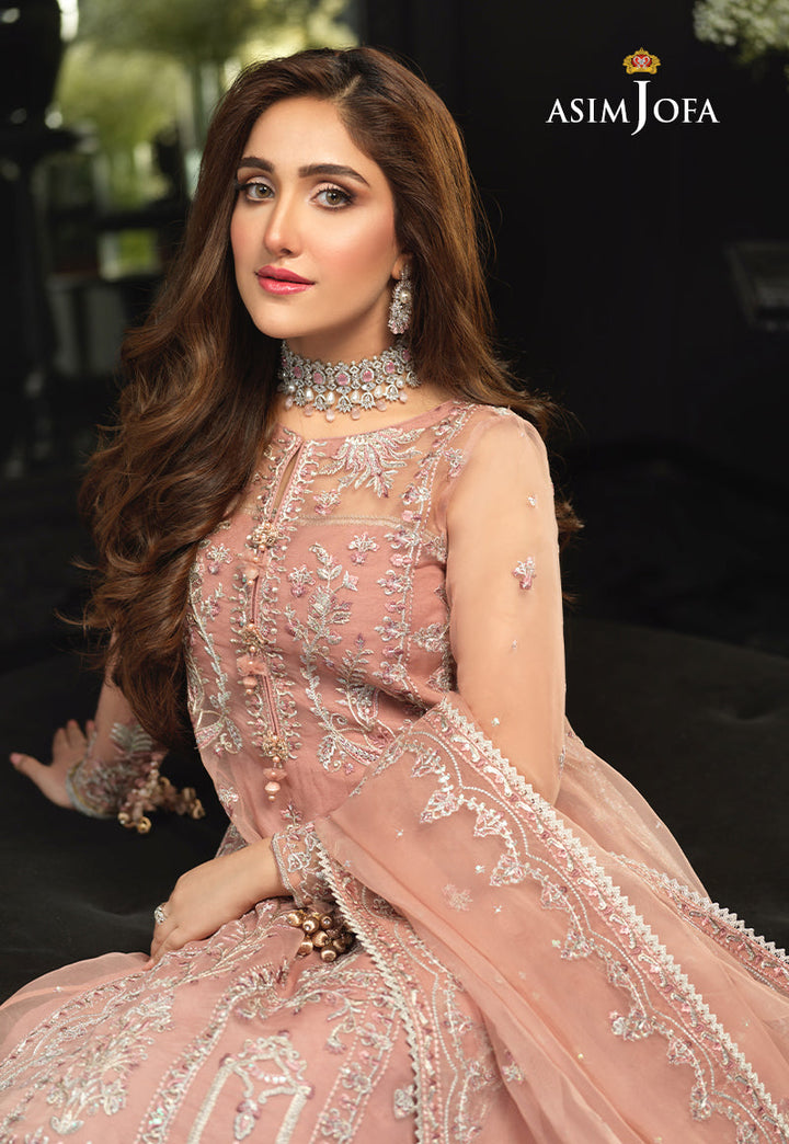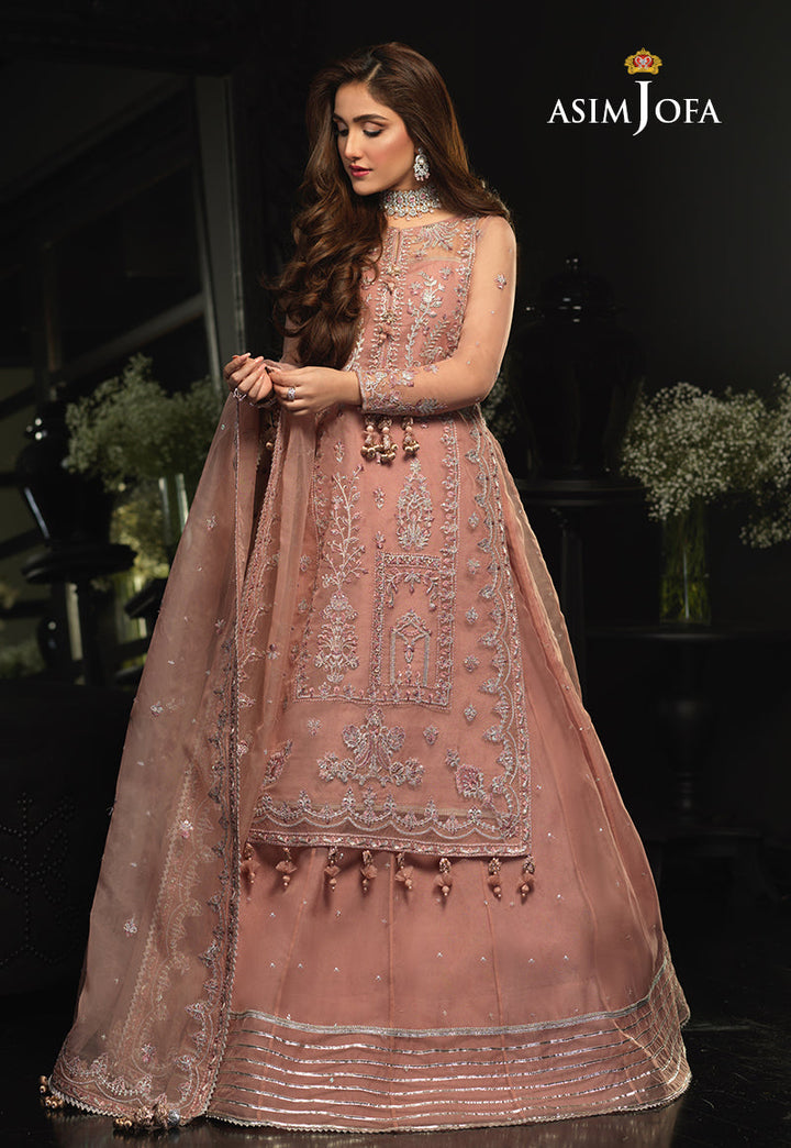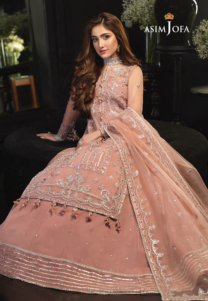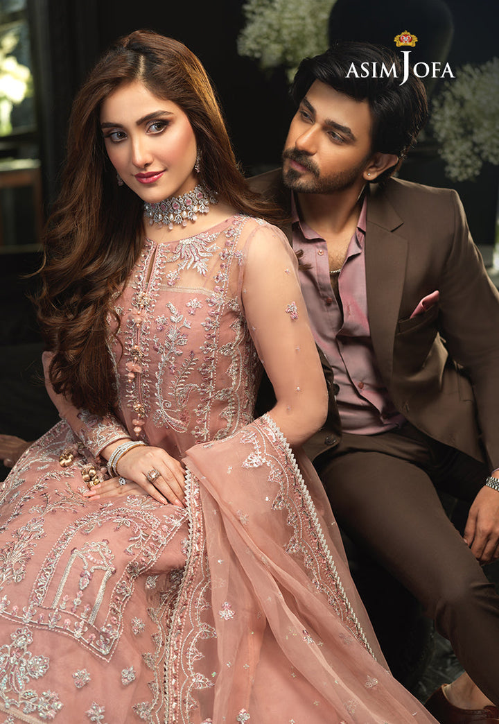 Get struck by Aiza’s stunning avatar in this breath taking design from Ishq-e-Naubahar. Clad in this beautiful dusty pink organza shirt worked in silver zari, badla and holographic sequins giving it a mesmerizing shine. The design is an asymmetrical pattern with floral imagery done with stunning detail. It is more dramatized by the addition of a heavily decked dupatta which is worked on four sided border and chan in middle with a lehnga sprinkled with spangles on organza. Dazzle all by donning this tasteful attire.