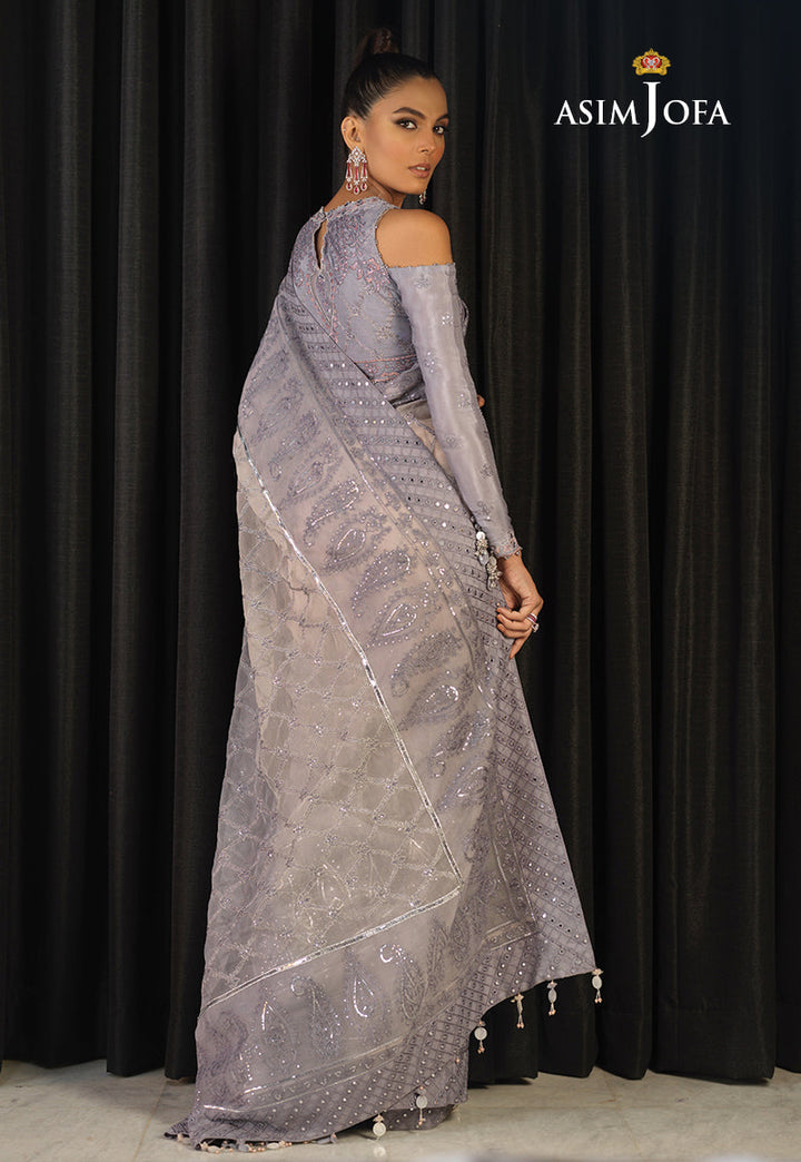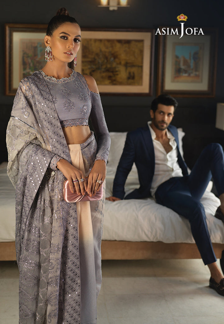 Muskh Kaleem completely nails this elegant saree. Dyed ombre’ in the shades of palest peach dissolving into flint gray creating a sheer canvas for the saree worked in a trellis pattern, aari taanka twisted with silver zari and sequins, a paisley motif border runs along the hemline and pallu along with an additional border of 9mm sequins uplifting it to another level. The blouse is completely embellished in monotones with a touch of sequins to complement the heavy saree. This unique saree will be a timeless addition in your precious wardrobe.