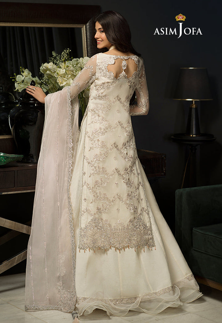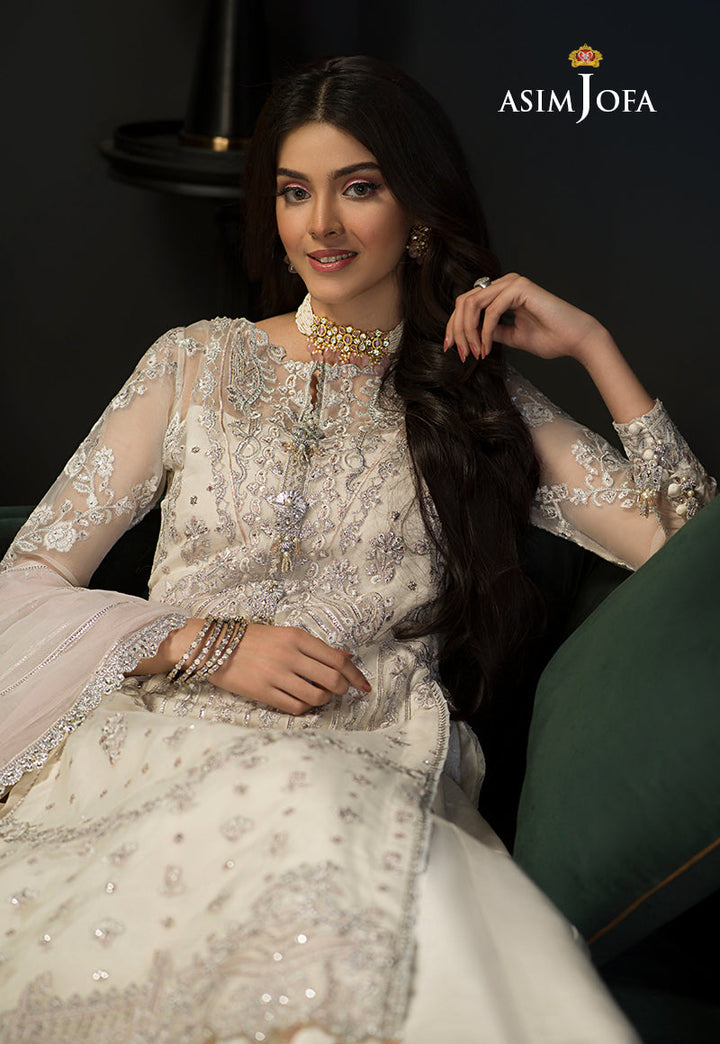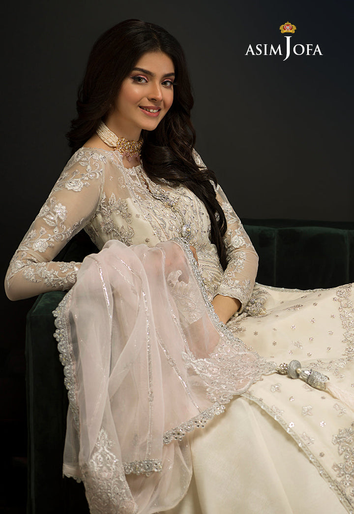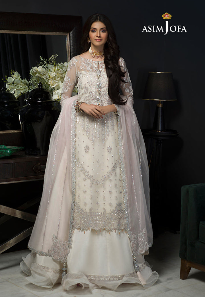 Zainab Shabbir is looking ethereal in this elegant white ensemble. A heavy long shirt is etched with filigree embroidery rendered on ivory organza canvas involving muted pink threadwork tints enlightened by silver badla and zari with a shower of shimmery spangles giving it an ecstatic glow. Its dupatta is worked delicately in linear embroidery pattern done on tinted pink organza. It is adorned with heavy corner motifs on all four sides. The plain cotton silk lehnga is trimmed with a thin embroidered border for its edge.
