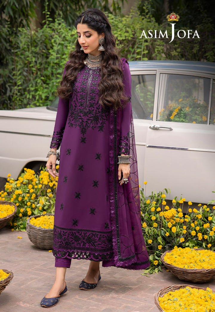 Step into a realm where elegance whispers on every thread of this royal purple ensemble. The shirt, a canvas of aspirations, is adorned with intricate black threadwork and sequins embroidery, where each stitch is a secret shared among petals. An embroidered neckline on Organza is a reflection of dreams, while central and side panels embody tales of timeless charm. Embroidered sleeves and hemline borders brush against eternity's edge. A Chiffon dupatta, like a soft sigh, and a dyed Lawn Silk trouser complete this enigmatic ensemble.