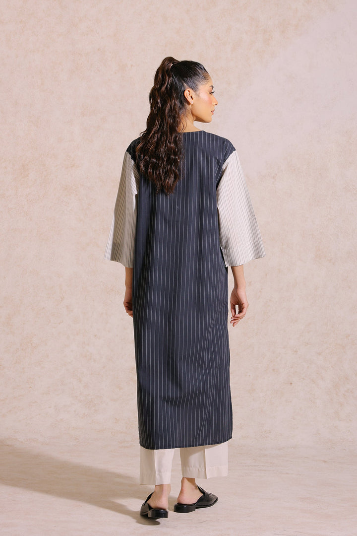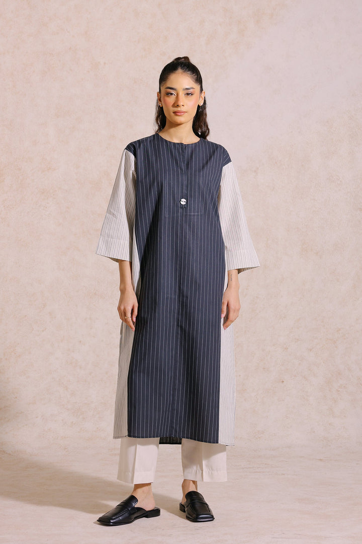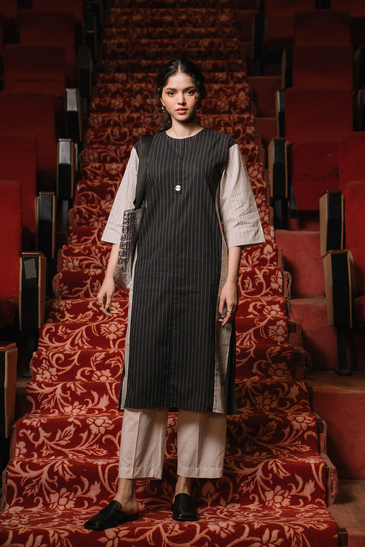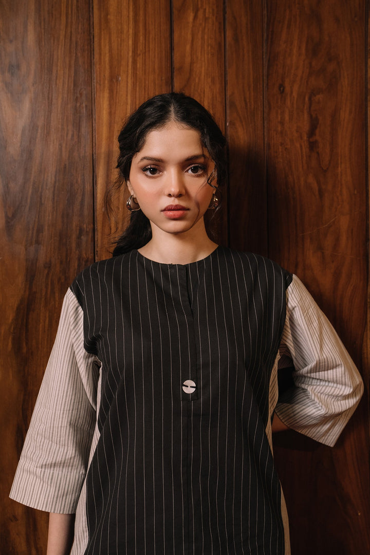 A gracefully chic composition is portrayed on this elegant ensemble rendered in lemon icing shade. It depicts a contemporary shirt crafted in a trendy silhouette with contrasted monochromatic shades and adorned with attractive stripes. Enhanced with trendy button at front, the contemporary shirt is paired with a solid trouser, a great addition to your everyday wardrobe.