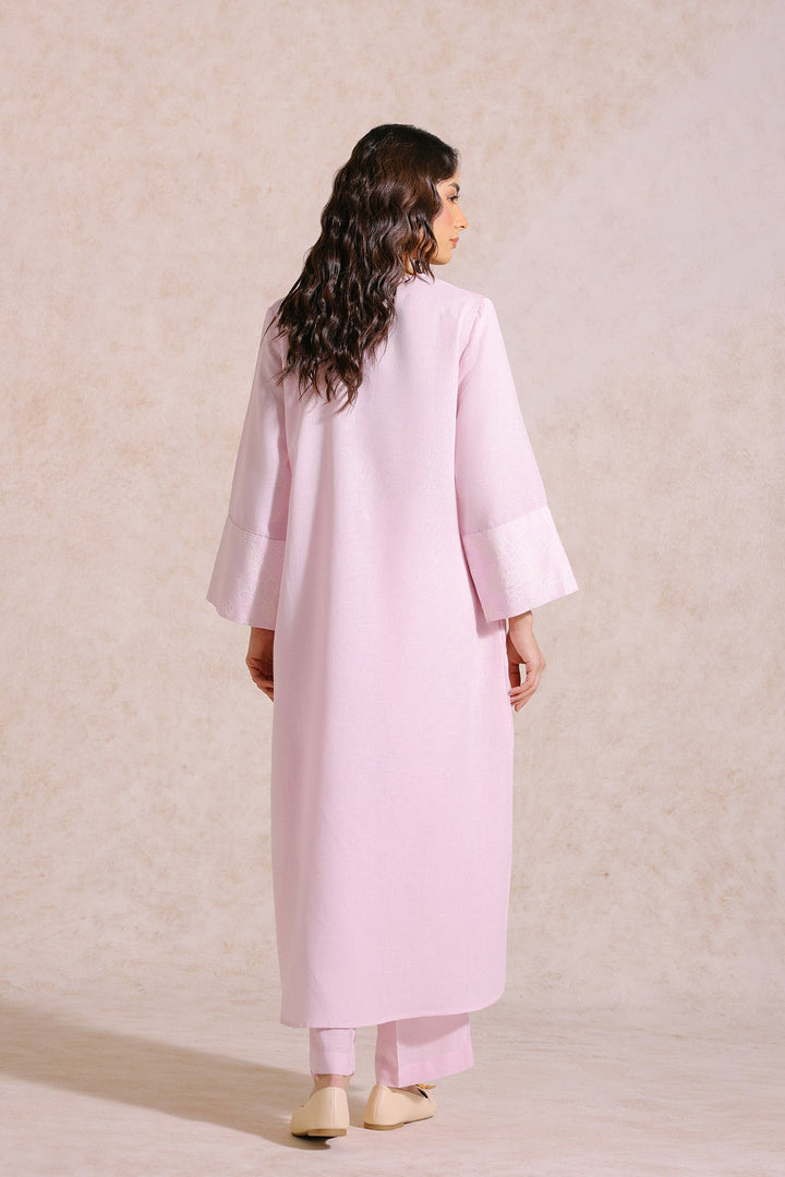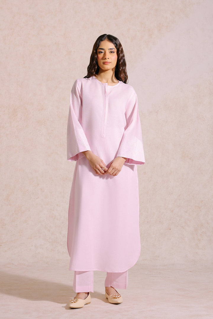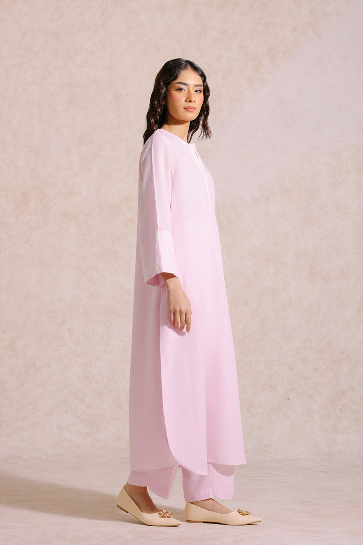 This contemporary outfit is an elegant 2-piece set perfect for everyday events. The light pink shirt features a graceful silhouette and adorned with screen printing at sleeves. The solid trousers complete the sophisticated look to style this season.