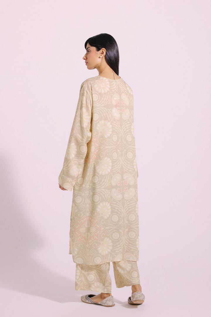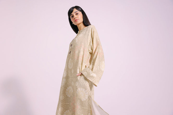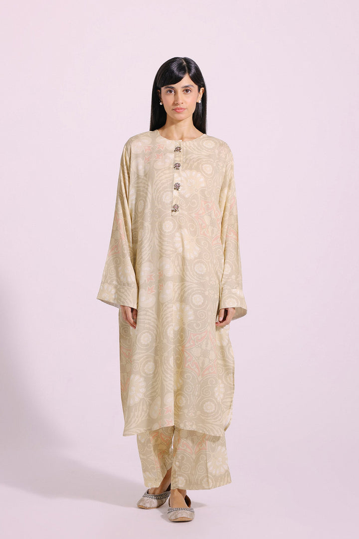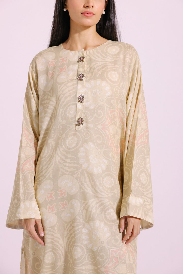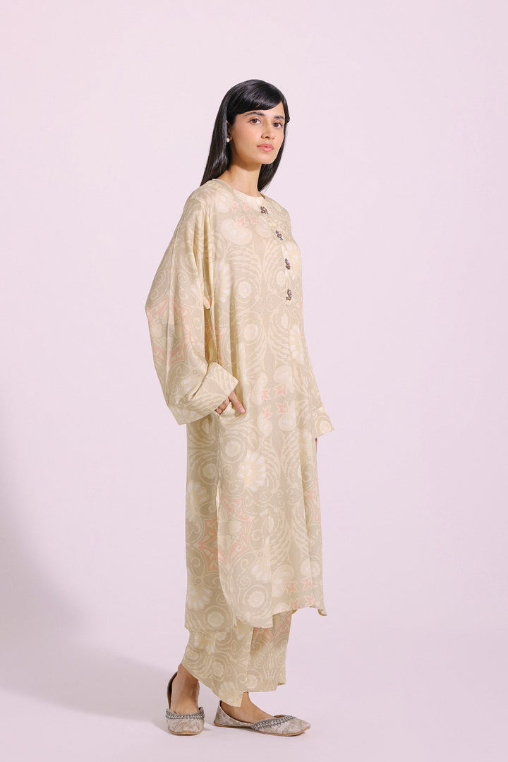 Be effortlessly stylish in this two-piece, artistic ensemble rendered in yellow beige shade. It features a contemporary shirt enriched with beautiful floral prints in mesmerizing hues and enhanced with trendy beads embellishments at front placket. Perfectly tailored in a long silhouette and paired with matching trousers, you'll look chic and sophisticated in this must-have outfit.
