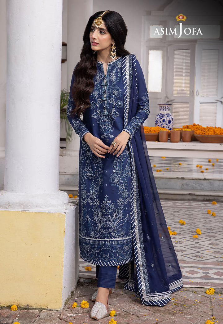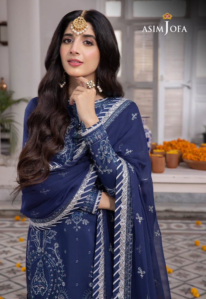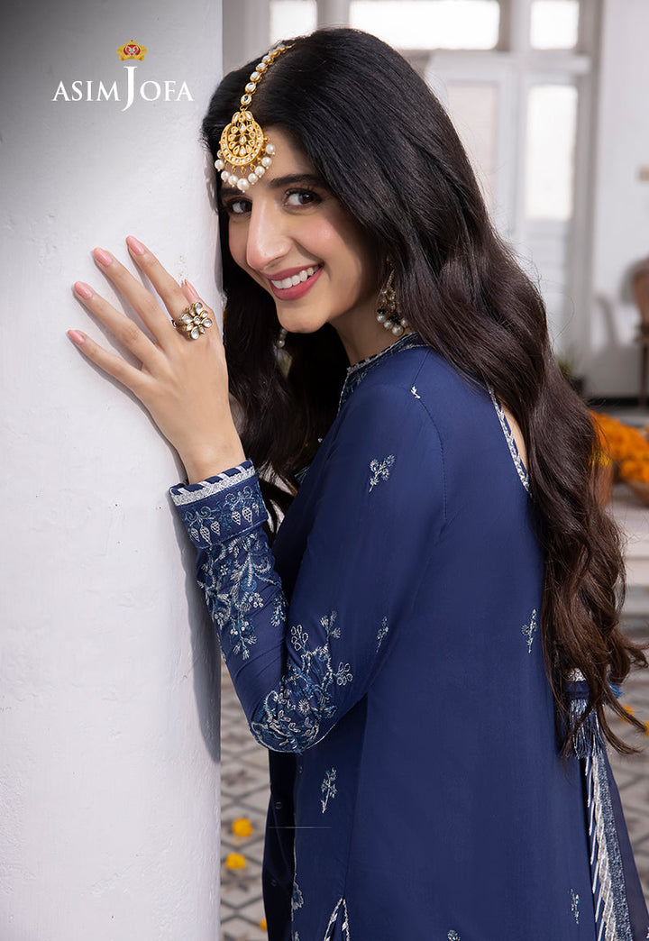 This classy navy blue ensemble donned by Mawra Hocane is a dreamscape brought to life from Asim Jofa's 'Abresham Collection.' The design is a portal to a world of baroque and floral wonders. The shimmering zari, sequins, and threadwork create an aesthetically pleasing symphony. The complementing dupatta is like a gentle breeze under the skyline, making this ensemble a true work of art.