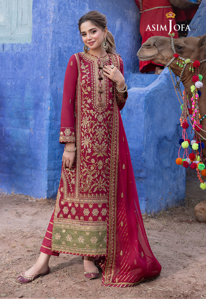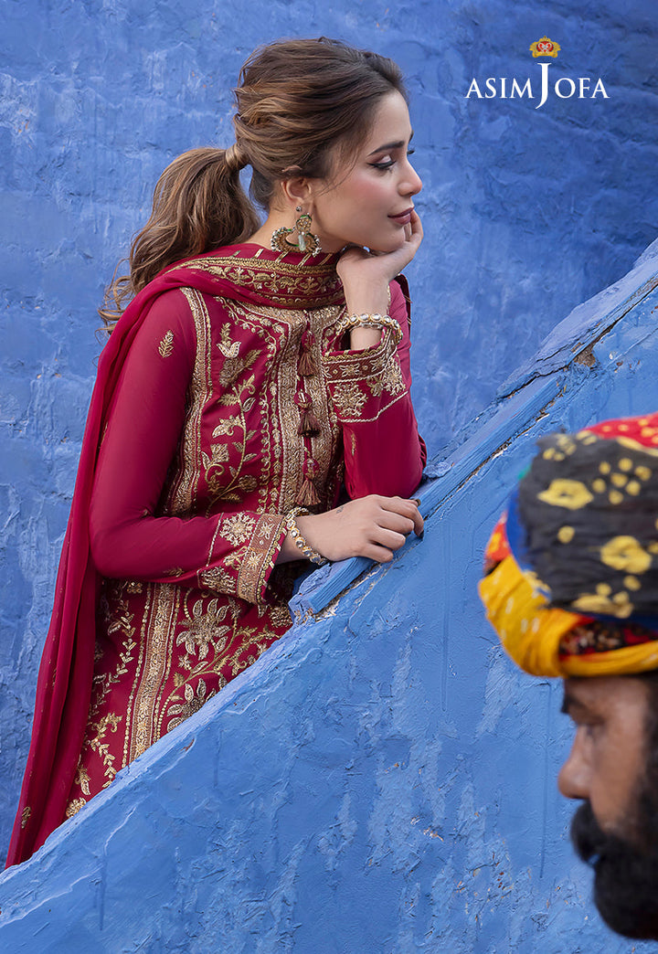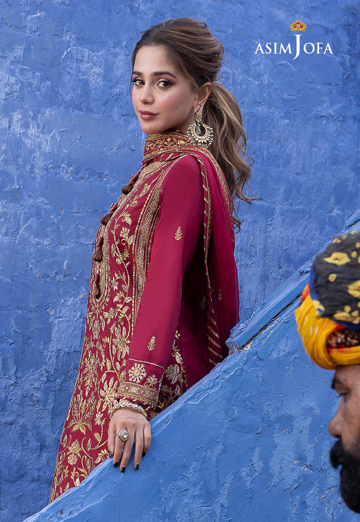 In this maroon creation from “Abresham Collection” graced by the ethereal Aima Baig, we witness the alchemy of art and tradition. Gold zari and sequins intermingle creating an opulent tapestry. The mehendi-hued contrast border on the shirt's daman is a stroke of artistic genius, a nod to South Asian craftsmanship. This attire is a canvas of culture, embroidered with precision on the front center panel, back, sleeves, and borders. A work of sartorial poetry, this ensemble is a testament to the enduring allure of intricate detailing.