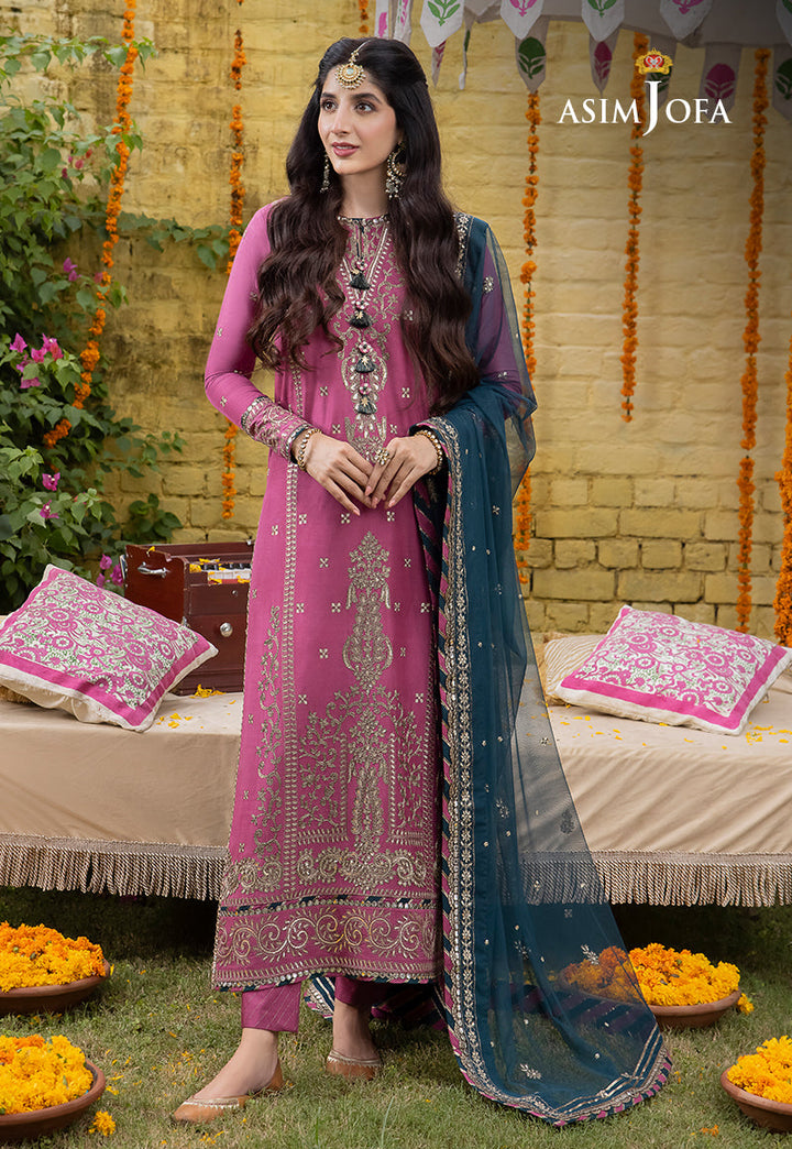 In the 'Abresham Collection' by Asim Jofa, Mawra Hocane whispers the secrets of spring through this rose pink and teal ensemble. This pink shirt is embellished with two toned mink zari, dori and sequins, is like a canvas of blooming beauty. Mixed motifs inspired by baroque and acanthus elements evoke the essence of nature. The teal dupatta is adorned with a splendid border and floral motifs are a testament to the season's rejuvenation.