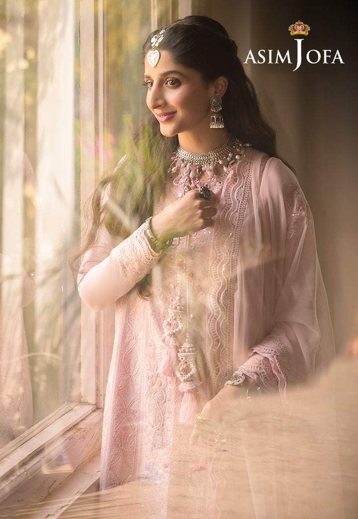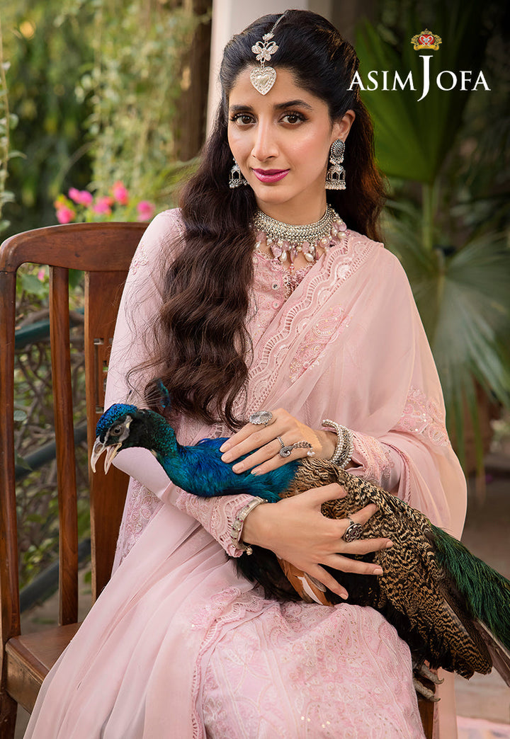 Mawra Hocane takes center stage as an embodiment of elegance, draped in an ensemble that reads like a love letter to luxury. This design, a tapestry of opulent imagination, showcases paisley and arabesque motifs intertwined like threads in a beguiling story. The embroidery, like verses penned by a poet's heart, graces the ensemble's entirety with an eloquence that transcends time. Sequins adorned like luminescent stars which infuse an ethereal allure. Scalloped borders on the shirt and dupatta echo the architectural intricacies of a bygone era, framing the ensemble like a canvas for cherished memories.