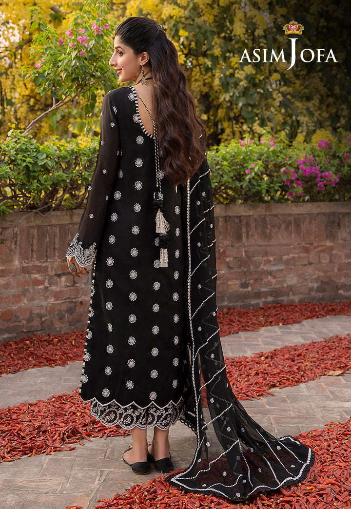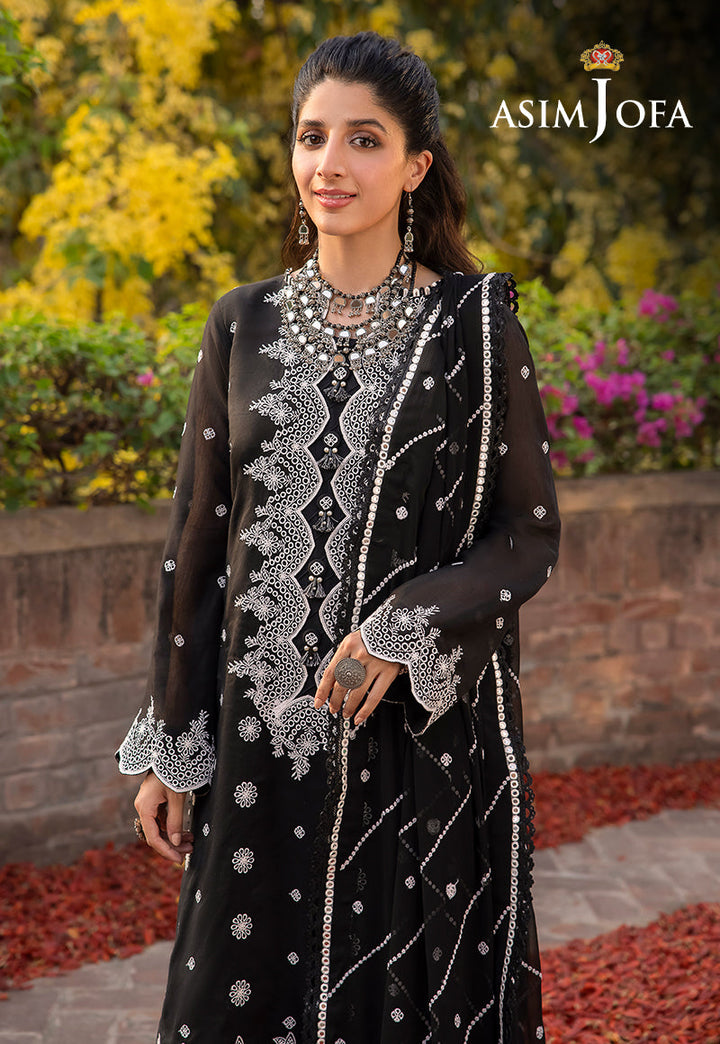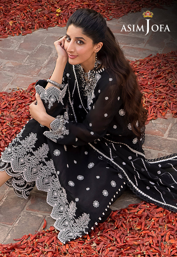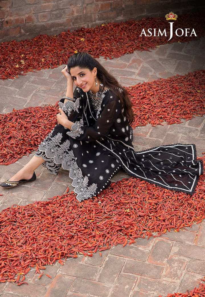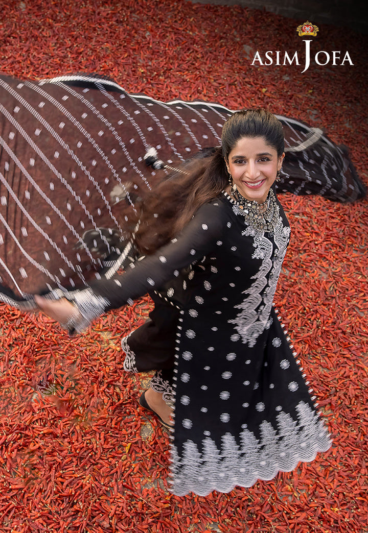 Asim Jofa's "Shadow Work" collection, as worn by model Mawra Hocane, becomes an epitome of elegance draped in an ensemble that mirrors the mysteries of the night sky. This monochromatic marvel, shrouded in black and adorned with white arabesque embroidery, is reminiscent of stars twinkling against a nocturnal canvas. The ensemble's beautiful sleeves and borders resemble constellations, while the breathtaking neckline and dupatta, kissed by diagonal stripes, capture the ethereal beauty of shooting stars.
