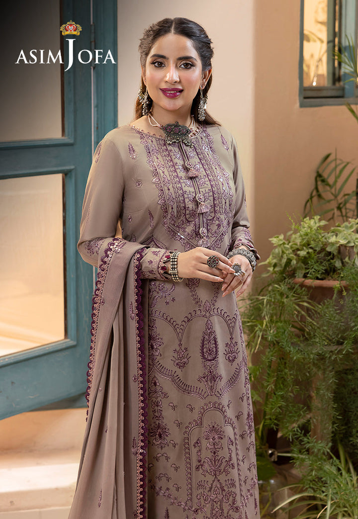 Discover the allure of 'Shadow Work' embroidery reimagined for the modern wardrobe. Our latest collection “Shadow Work” features an exquisite design in metallic grey, harmonizing the richness of purple embroidery with the shimmer of sequins. The motif intricately weaves the essence of damask and ethnic patterns, resulting in an artistic masterpiece. This ensemble comprises an embroidered center panel on lawn silk, paired with matching embroidered side panels and a mesmerizingly detailed back. Elevate your style with ensembles by Asim Jofa that carry the weight of heritage while embracing contemporary grace.