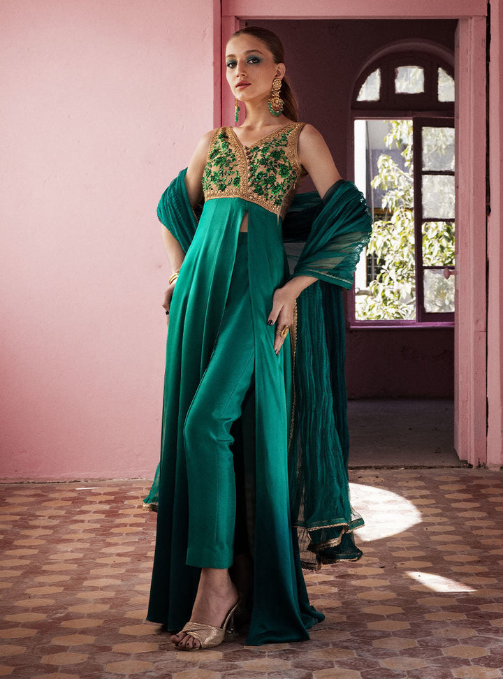 Dynamize your style by wearing this spectacular silk front open dress with a lovely embroidered bodice, elegantly decorated with hand embellishments. This modern silhouette is paired with matching pants and a crush dupatta, giving it a perfect festive vibe.