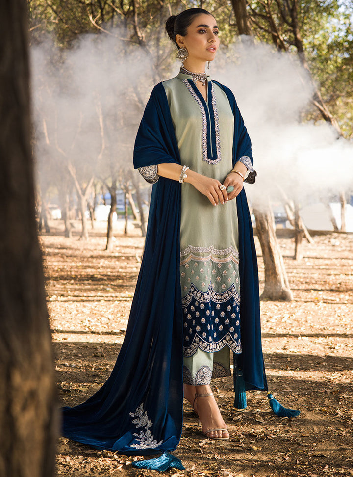 Look effortlessly classy in this attire. The perfect long mint shirt is beautifully allured with silver kora,dabka and kundan details on neckline. It is further enhanced with teal embellished velvet border on hemline and sleeves. It comes with straight pants.