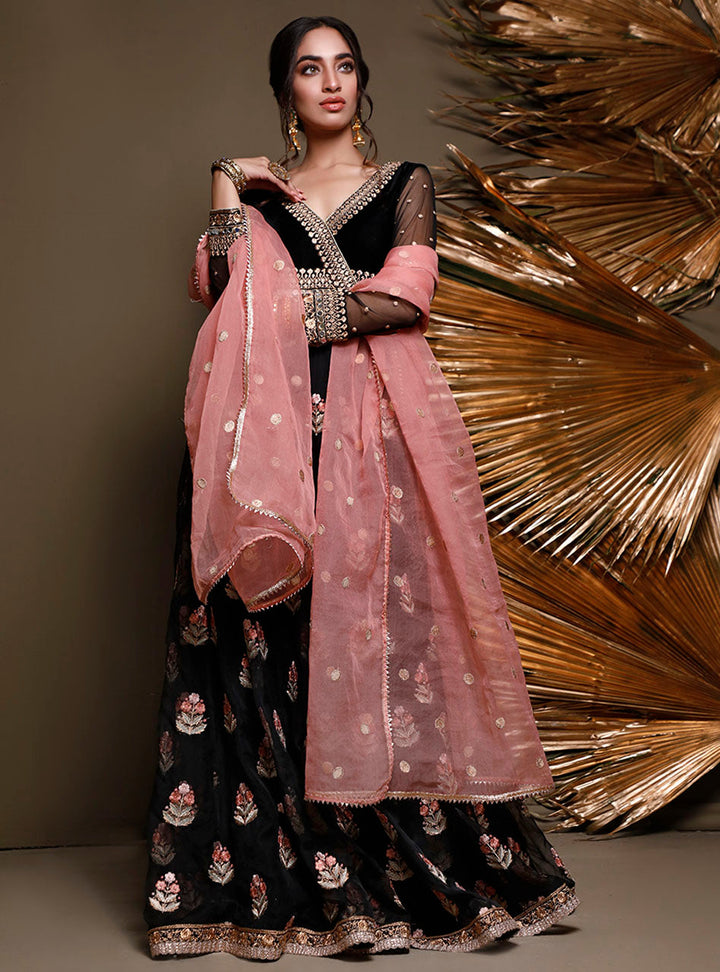 A gorgeous traditional Anarkali adorned with intricate thread worked neckline with the touch of mirrors and embroidered floral motifs all over the flare is a perfect choice for your winter weddings. It comes with plain pants and organza dupatta with embroidered polka dots and finished with gotta lace all around the edges.