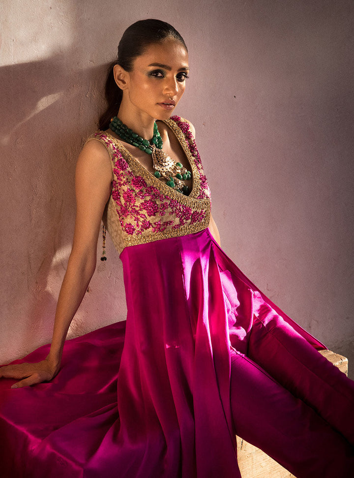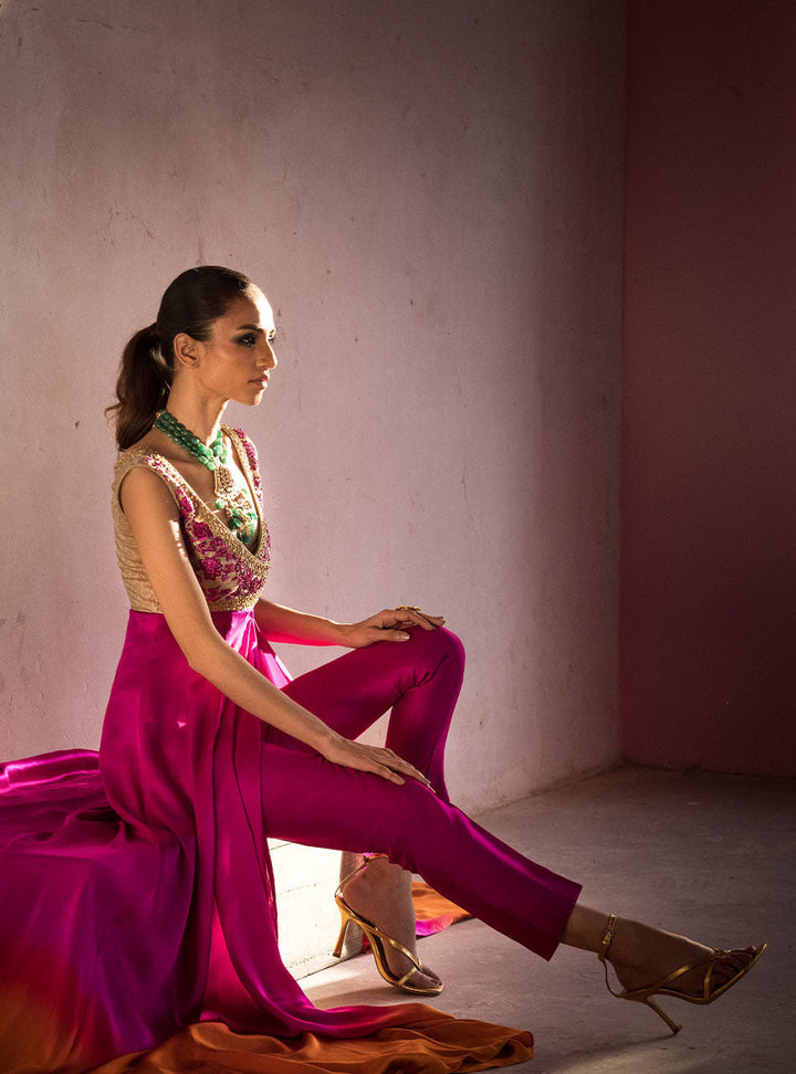 Stun the room in this vivacious silhouette, perfectly adorned with an intricately embellished bustier. The captivating ombre attire is paired with a crushed dupatta to complete the look.